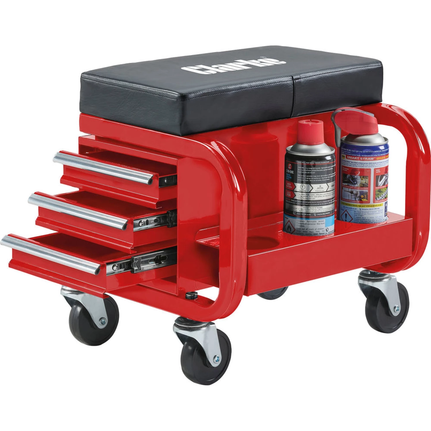 The three-drawer built in toolbox is ideal for storing tools for whatever project is being working on, being able to support 5kg each, whilst the 3 can holes are perfect for keeping the WD40 on hand when facing stubborn nuts and bolts. This mechanics seat also features a side tray for storing nuts, bolts, screws and drill bits etc.