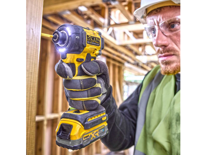 The 9-LED ring light (82 lumens) offers 20-minute continuous lighting, eliminating the need for external lighting sources. The DCF870N is powered by a brushless motor, maximizing battery efficiency and minimizing heat, extending tool life while reducing the need for maintenance. The variable speed trigger gives users precise control, and the compact, ergonomic design ensures comfort during prolonged use.