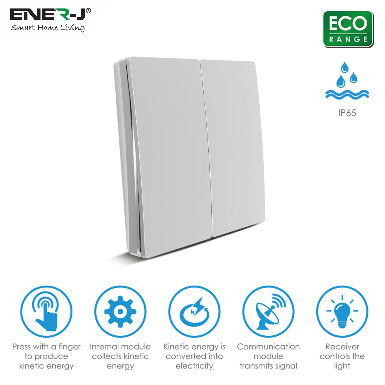 19.86 2025-12-07Experience the convenience of the ENER-J 2 Gang Wireless Kinetic Switch in Silver Finish along with 2x 500W RF Non Dimmable Receiver Module. With no batteries or wiring required, this eco-friendly switch can be installed anywhere. The wireless remote control allows for easy operation, and the effective range reaches up to 20 meters indoors and approximately 80 meters outdoors. The 500W RF Receiver Module fits into easily in the lighting circuit and can be paired in simple steps with the wireless kinetic switch. The Wireless Kinetic Switch needs no wiring, no batteries and no drilling of any holes in the wall and also is IP56 rated which means can be installed anywhere, whether indoors or outdoors.