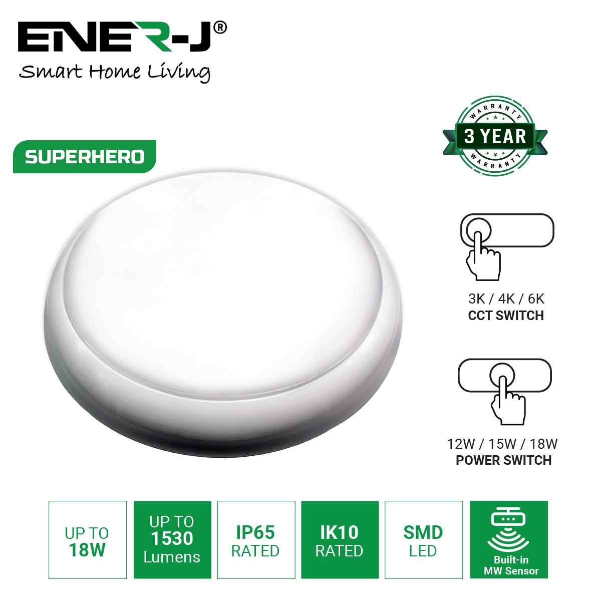 29.76 2025-12-07Experience ultimate flexibility and performance with the 9-in-1 SUPERHERO LED Bulkhead. With power (12W-15W-18W) and CCT switchable options and a built-in microwave sensor, this robust 320mm light fixture is perfect for any setting, from residential to commercial spaces. Its IP65 and IK10 ratings ensure durability and reliability, making it ideal for indoor and outdoor use.