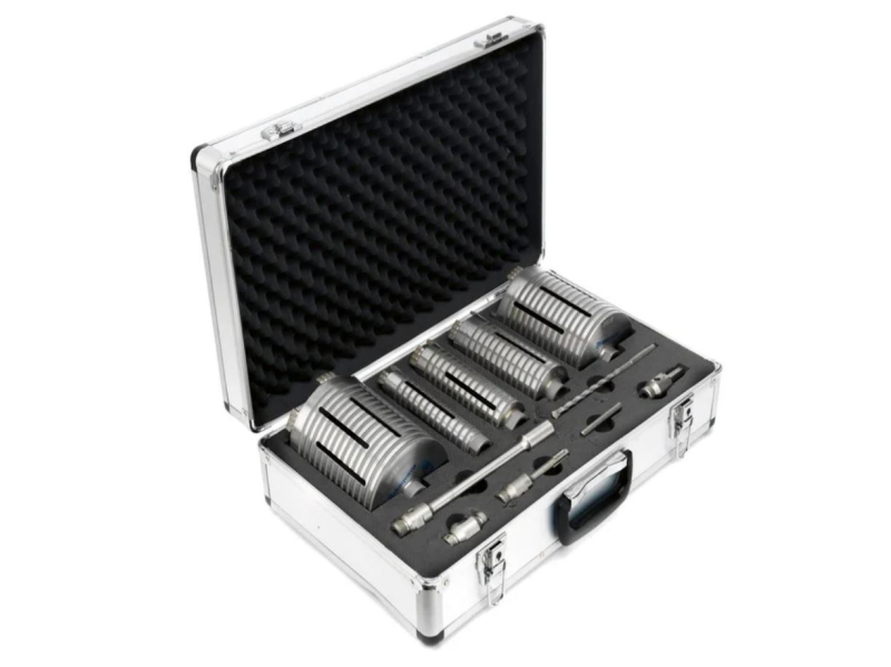 Key features of this set include a corrugated segment for less friction and higher speed drilling, a ventilation barrel for efficient dust removal, and laser-welded segments to the tube to minimize the risk of segment loss. These features make it an excellent tool for drilling into block cement, bricks, and hard concrete.