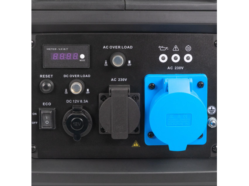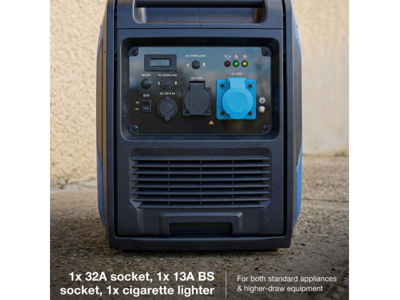 | Control Panel | 1x 32A industrial blue socket, 1x 13A BS socket, 1x cigarette lighter, 3-in-1 digital meter, ECO mode, AC Reset, E-Start |