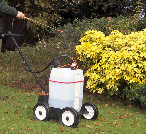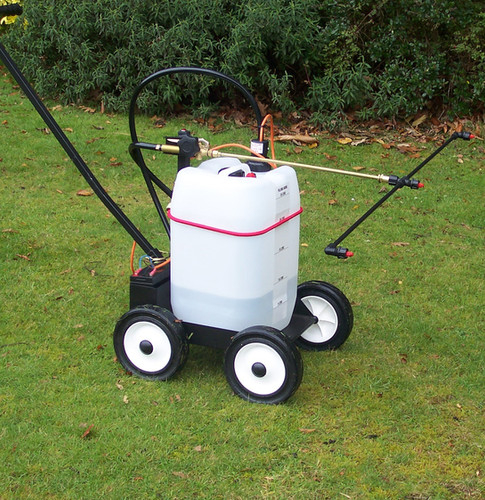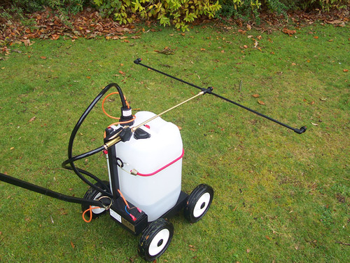 The sprayer is mounted on a durable chassis fitted with four 200mm (8") rubber-tyred wheels, ensuring excellent stability and effortless movement across various terrains.