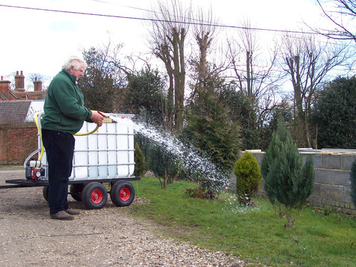 The caged tank is securely mounted on a flatbed trolley, while the petrol-powered pump is conveniently positioned at the front for easy access and efficient water delivery.