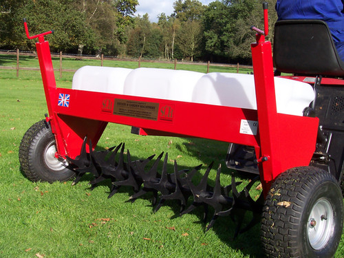 The aerator is supported by three 25-litre water-fillable ballast tanks, which, when filled, provide the necessary downward force to ensure effective penetration into even hardened soil surfaces.