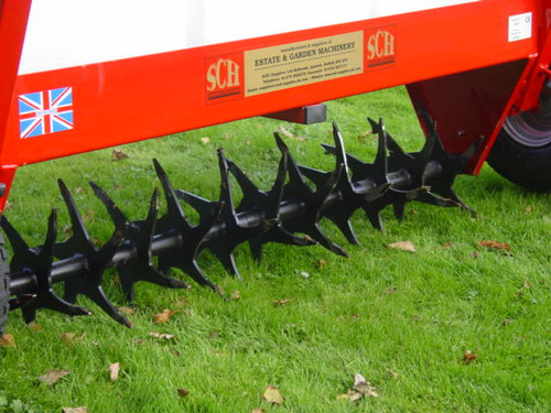 The SCH A48 Aerator Attachment, when used with the 48" Carrier Frame, is a highly effective tool for turf care, particularly suited for autumn use. It works by breaking through the surface pan of compacted soil, significantly improving drainage and promoting air circulation down to the root zone.