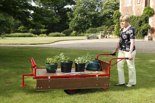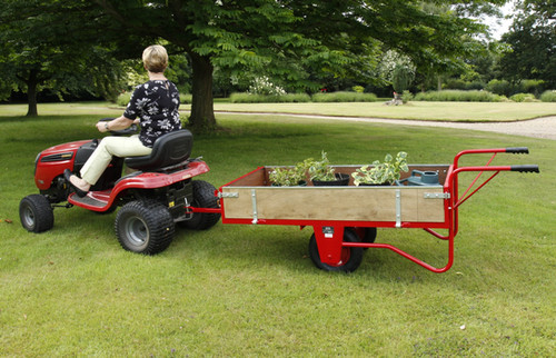 The cart can be manually pushed or conveniently towed using your garden tractor. Its tow bar can be swapped with a stable foot support, allowing flexibility for different tasks. For easy loading and unloading, the hinged wooden sides can be dropped down or removed entirely.