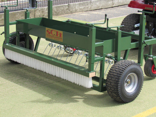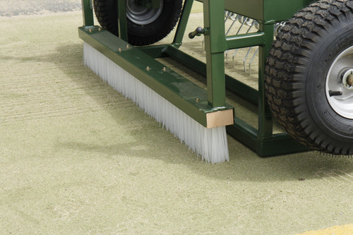 Following the tines, two rows of levelling bars redistribute and smooth the loosened infill material evenly across the surface. A rear strip brush provides the final grooming pass, ensuring a clean, professional finish.