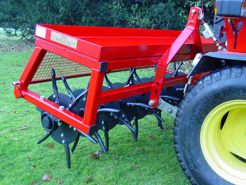 The SCH DHTC Hollow Tine Corer Attachment is designed to bolt directly onto the D System Mounted Carrier Frame in the same manner as the aerator or slitter. Engineered for effective soil aeration, this unit features revolving discs fitted with hollow spoon tines that remove compacted soil plugs from the turf.