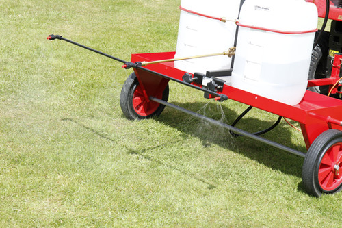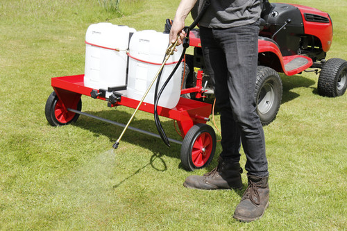 The system includes two 25-litre chemical containers, ensuring sufficient capacity for larger jobs. A 12-volt pump—powered directly from the tractor battery—delivers reliable and consistent spray performance. For targeted application, a brass trigger lance with a wedge nozzle provides a 915mm (36") spray width. Additionally, a three-nozzle boom is supplied for wider turf coverage.