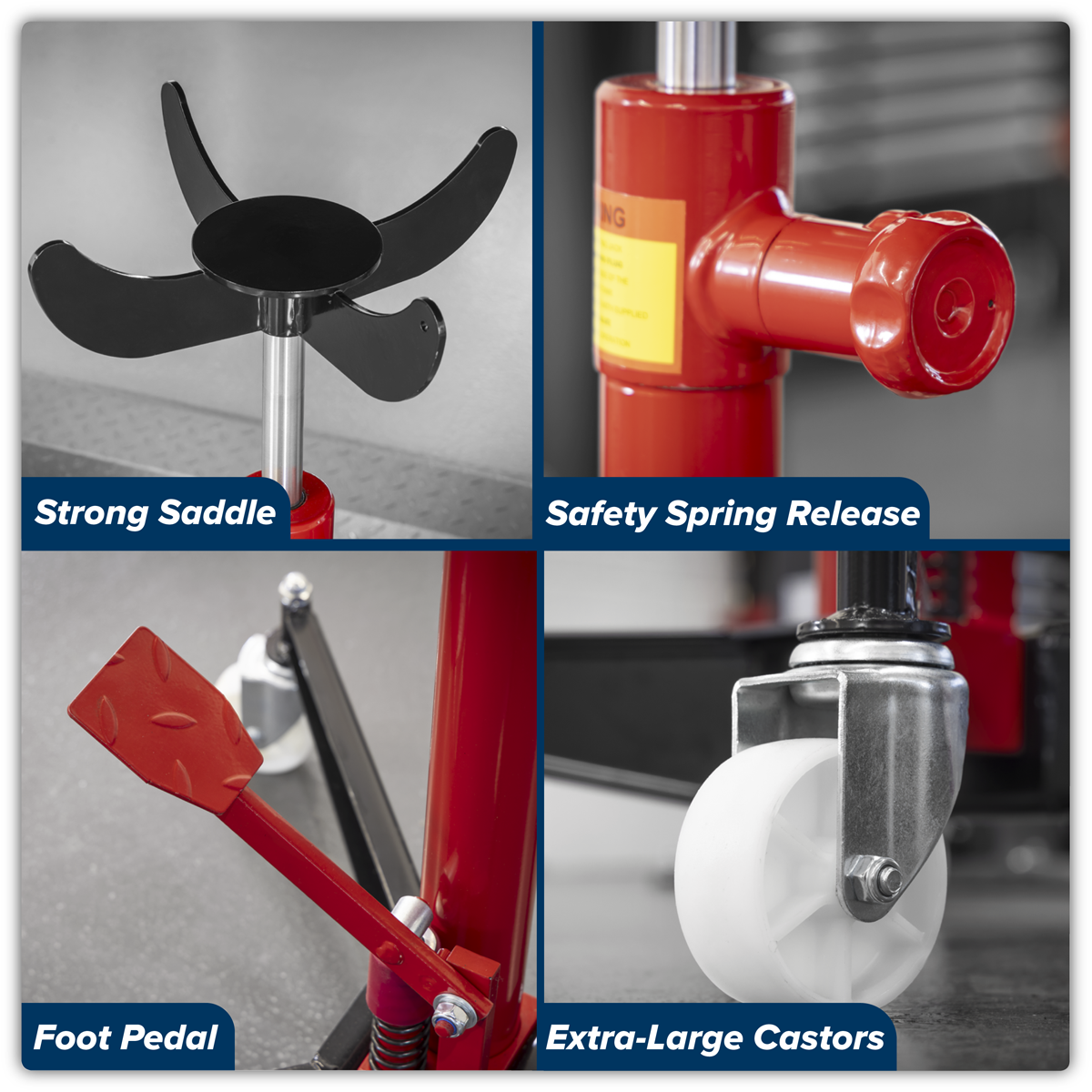 282.20 2026-05-05Manufactured to exacting standards, strong construction for durability and suitable for general workshop applications. Spring loaded dead man's safety release control reduces the risk of inadvertent lowering. 2-Way hydraulic unit ensures that the saddle lowers at a controlled speed at all times, even without load. Extra-large castors allow for increased manoeuvrability. Hydraulic unit larger than the economy models for improved performance and durability. Can be fitted with optional Adjustable Gearbox Support - check specification in table.