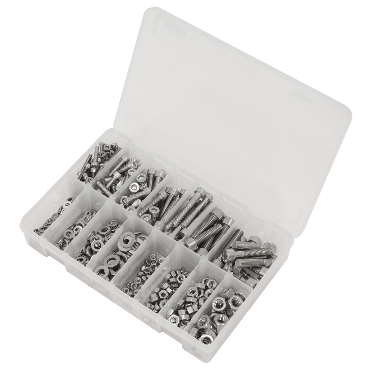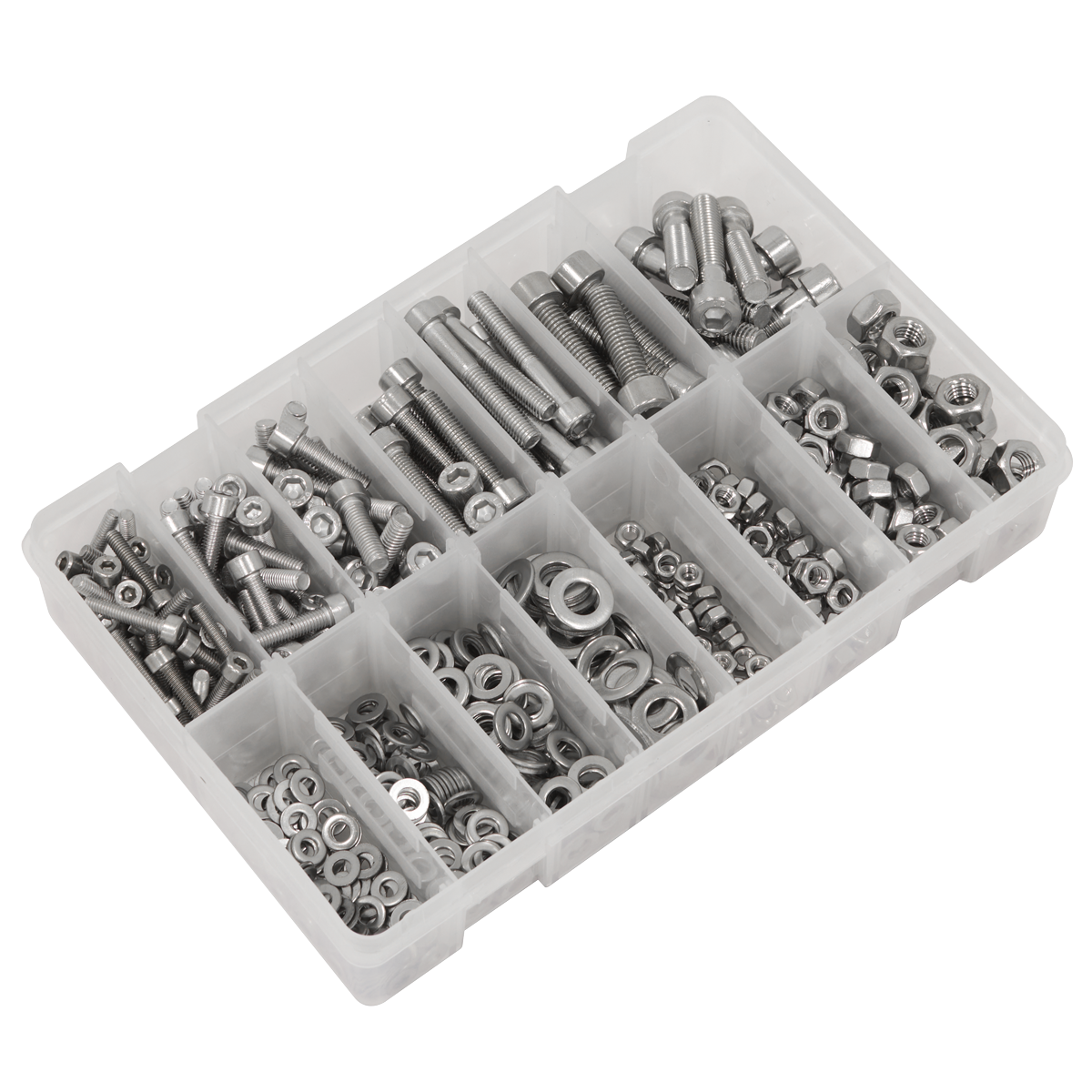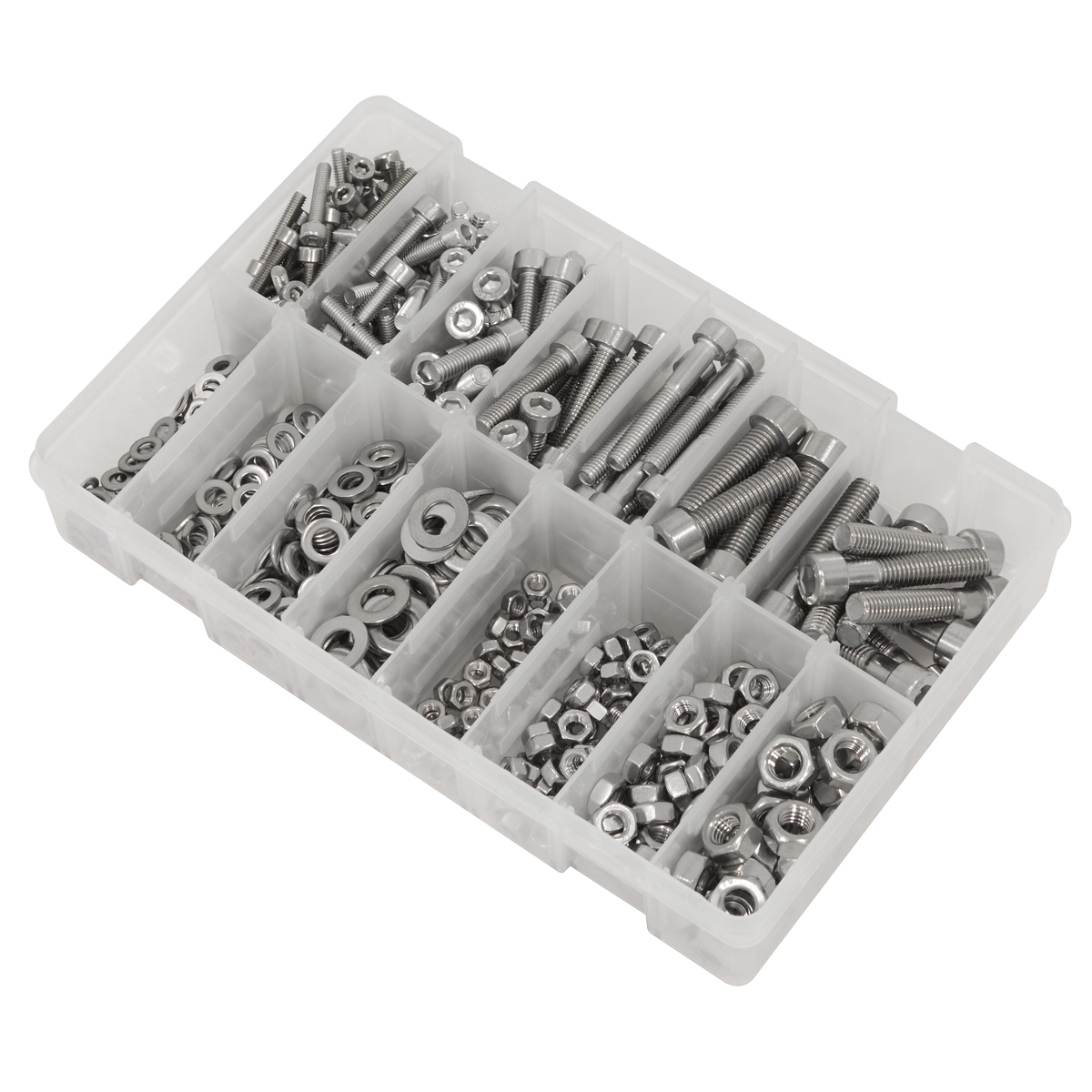 44.96 2026-01-03Made from A2 stainless steel. Offers excellent corrosion protection in harsh environments. Contains popular Metric sizes. Contains assorted sizes of Hex Socket bolts and corresponding nuts and washers. DIN Standards: Bolts; DIN 912, Nuts; DIN 934, Washers; DIN 125. Supplied in a partitioned box. Contents: Bolts; M4 x 20 (x50), M5 X 20 (x30),M6 X 20 (x20), M6 x 30 (x15), M6 x 40 (x15), M8 x 30 (x10), M8 x 40 (x10), Washers; M4 (x100), M5 (x100), M6 (x100), M8 (x80), Nuts; M4 (x50), M5 (x50, M6 (x50), M8 (x30).