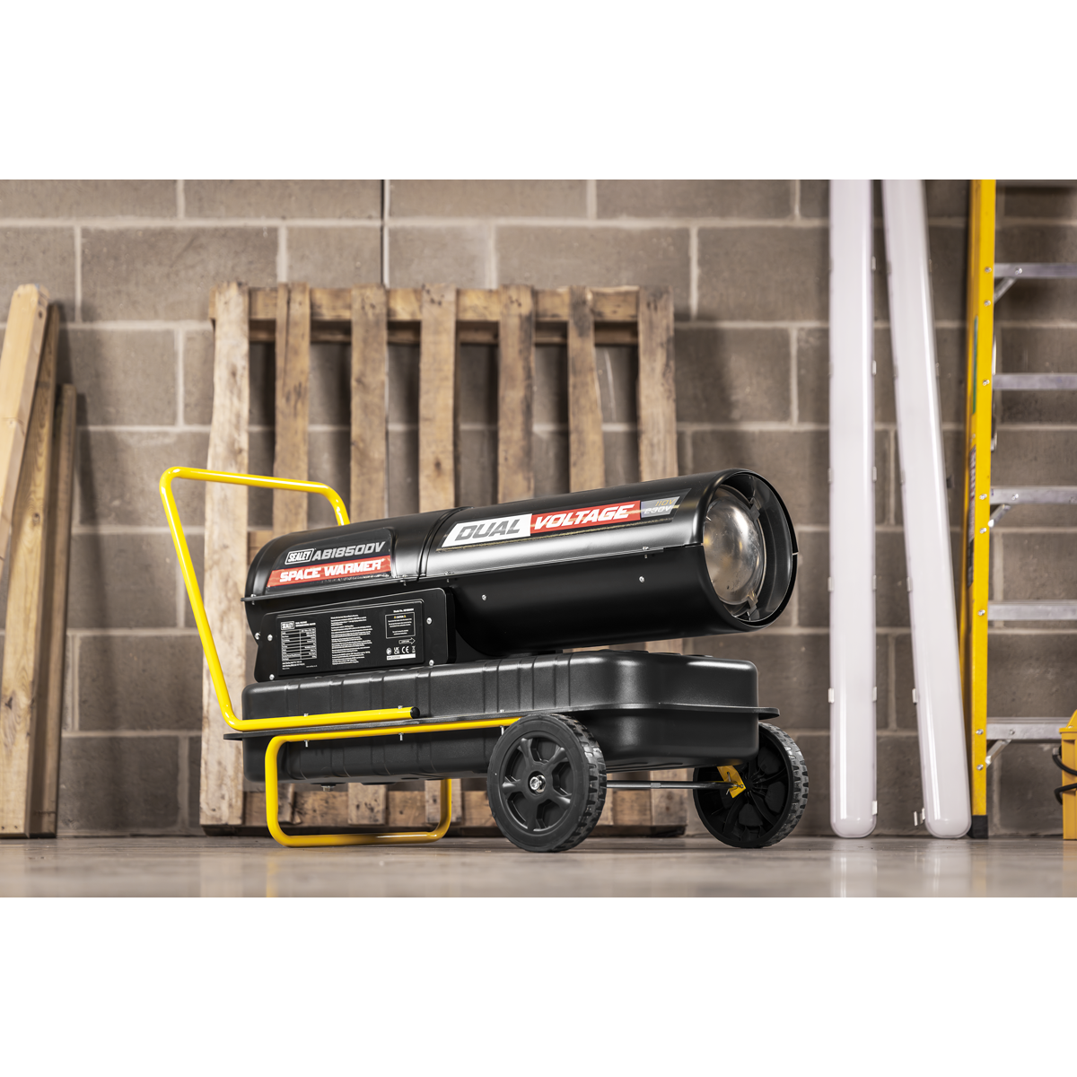 547.15 2026-01-11Dual voltage space warmer with 185,000Btu/hr (55kW) Heat output. Can be used with either 230V or 110V supply with the switch of a plug. Clean burning and proven pump system can operate with either kerosene or diesel. Large 50L tank with an 10hr usage on a single tank of fuel. Ideal for use in workshops, garages or factories. With its stainless steel combustion chamber and a dual LED Display, this unit makes it easy to keep the temperature of any workspace controlled. Fitted with safety cut-outs and fuel gauge, plus a sturdy handle and heavy-duty wheels for easy manoeuvrability.