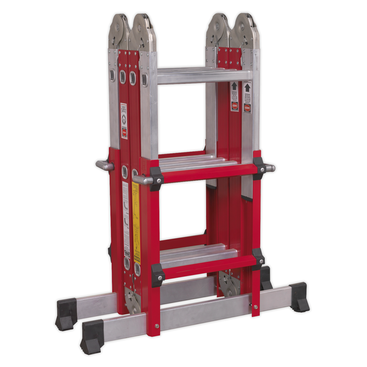 278.95 2026-05-18EN 131 Certified 4-way, 4-section, aluminium ladder. Six robust auto-latching locking hinges allow for multi-positioning. Can be used as a platform, straight ladder, step ladder or offset ladder. Extra safety provided by 12 reinforced rungs and stabiliser feet. Fitted with extendable legs providing increased climbing height. Supplied with metal platform to use in platform/scaffold position.
