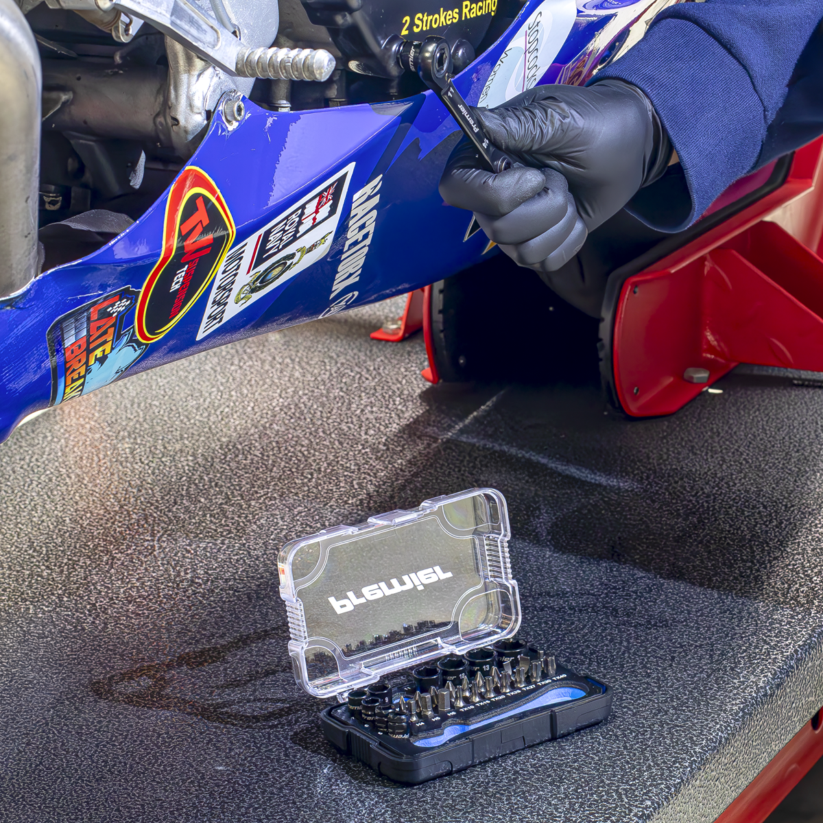 35.36 2025-11-21Manufactured from hardened and tempered Chrome Vanadium steel with an electrodeposition finish. Ultra-smooth, flip reverse double end ratchet spanner combining go-through socket and 1/4"Hex drive. Go-through sockets for use on fixings with extended studs and adjusting screw locknuts. Lock-on™ sockets enable use on up to 85% rounded fasteners. Low profile sockets and bits, ideal for limited access applications. Supplied in storage case.