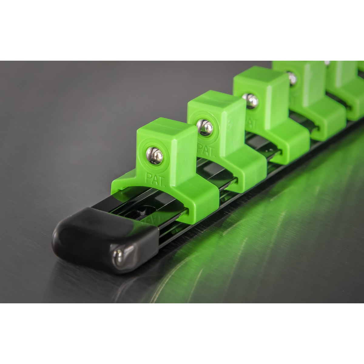 13.70 2026-03-22Aluminium socket rail with high visibility green nylon clips. Holds up to 16 x 1/2"Sq drive sockets.