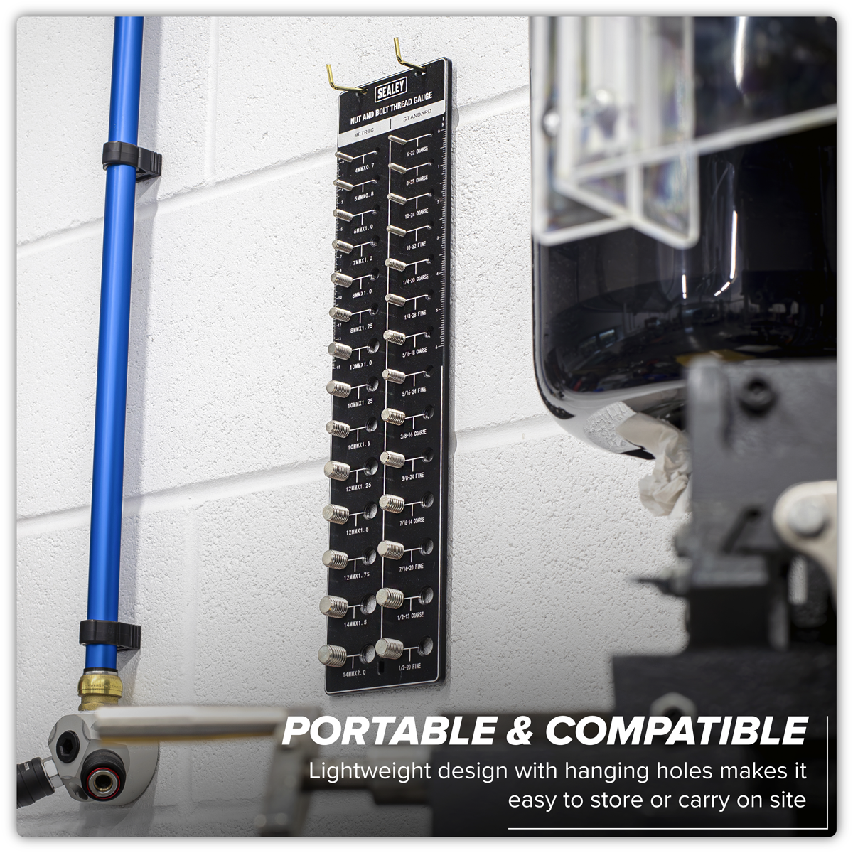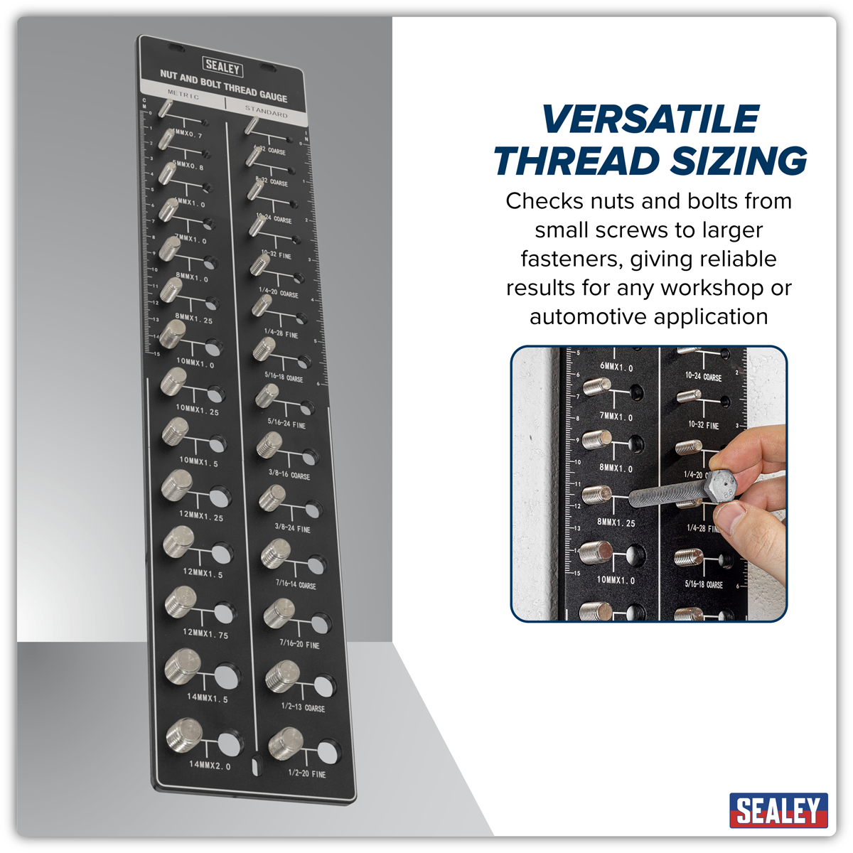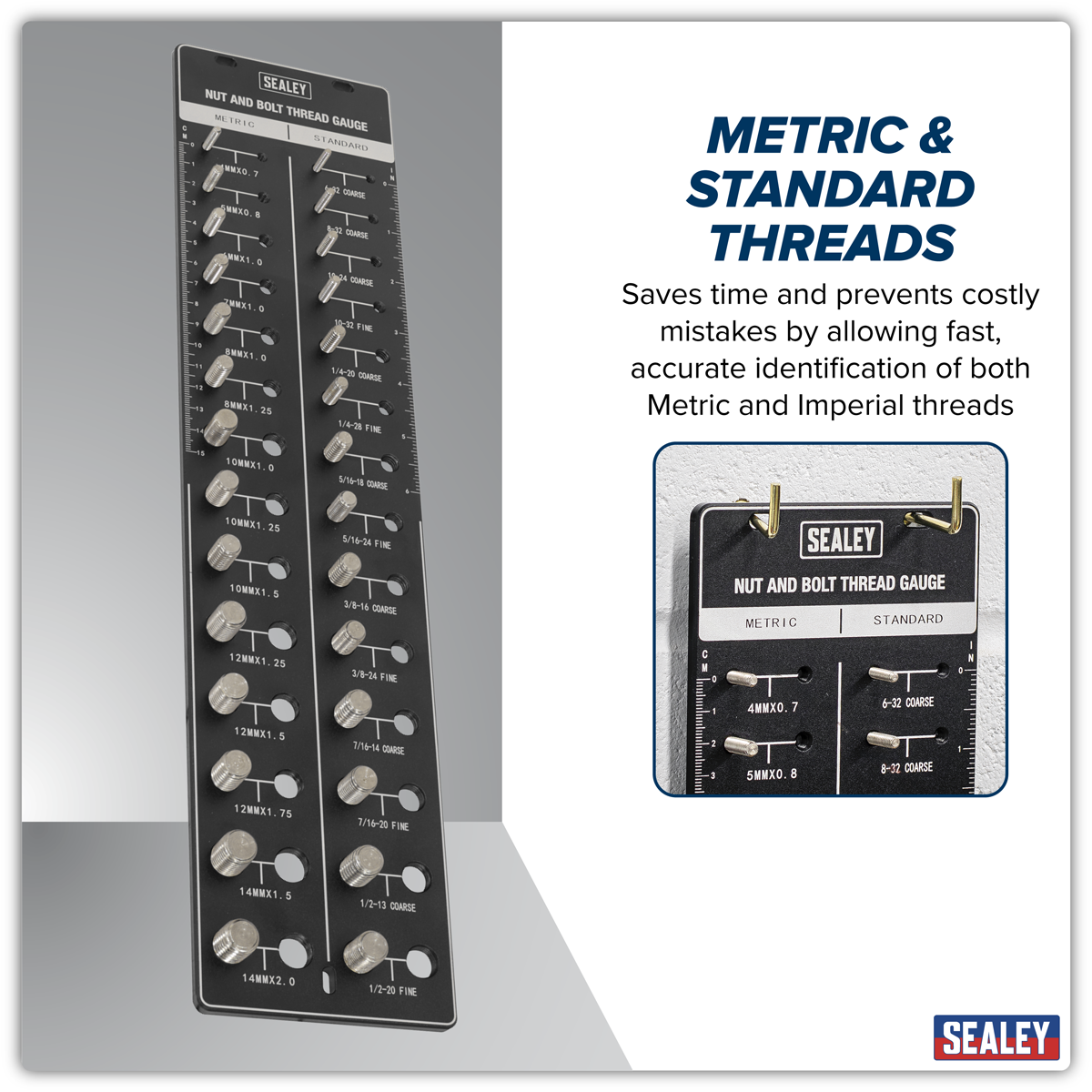 34.76 2026-05-06Accurately measures and identifies threads. 14 Imperial (6 to 1/2") and 14 Metric (M4 to M14) sizes in coarse and fine pitches. Easy-to-read markings make male and female versions of each size easy to identify.