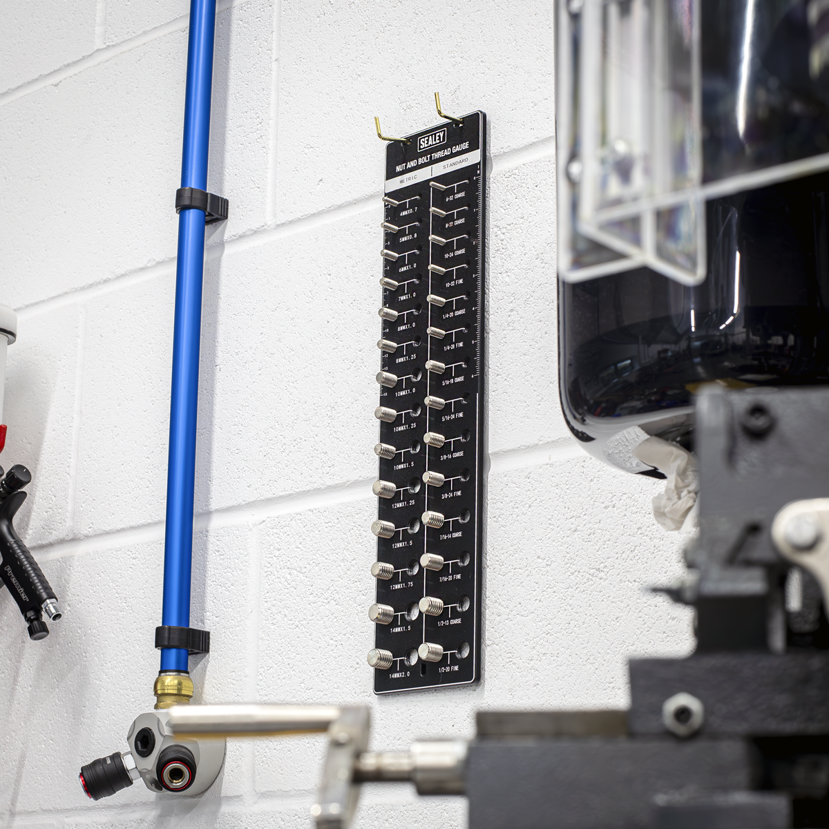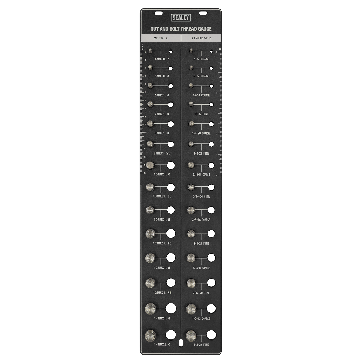 34.76 2026-05-26Accurately measures and identifies threads. 14 Imperial (6 to 1/2") and 14 Metric (M4 to M14) sizes in coarse and fine pitches. Easy-to-read markings make male and female versions of each size easy to identify.
