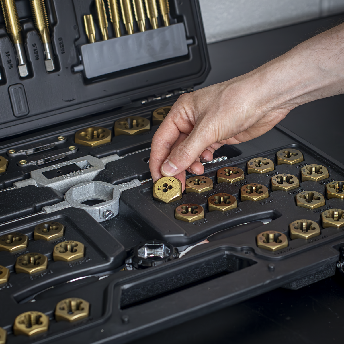 135.56 2026-03-22High quality Titanium coated taps and dies. Set contains both Metric and Imperial sizes. Features hex shaped dies providing a more secure fit in the die holder. Dies can also be used with a socket or spanner. Set includes T-handled tap wrench, double-ended tap wrench, die handle, Metric and Imperial thread gauge and screwdriver. Supplied in storage case.
