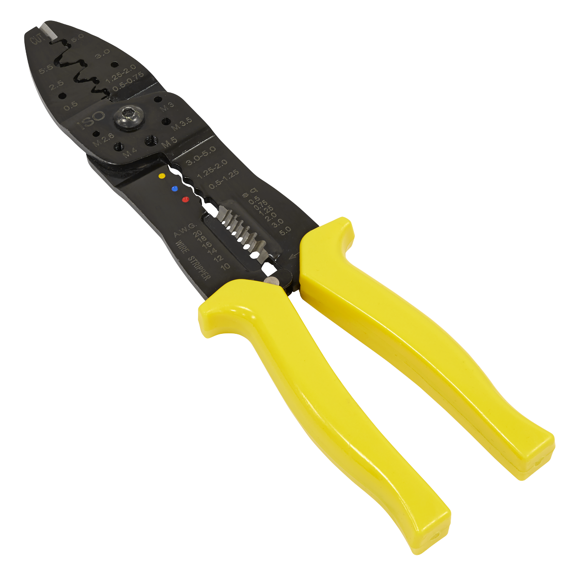 20.72 2026-01-17Can crimp insulated terminals ranging from 0.5-5.0mm², non-insulated terminals ranging from 0.5-5.5mm², shear bolts from M2.6-M5 and strip wires from 0.5-5mm². Features wire cutters for soft cables and wires. Constructed from 4mm steel with high-strength jaws. Crimp slots are colour-coded in yellow, blue, and red for easy identification of the correct terminal size. PVC handle for comfort.