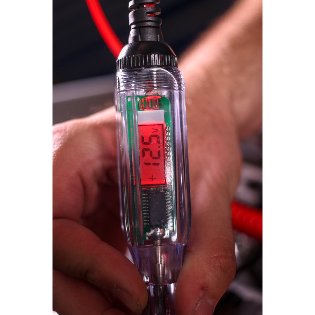 36.98 2025-12-01Identifies polarity of circuit being tested on LCD display, red for positive and green for negative. LCD meter draws minute currents making this tool safe to use around delicate electronic components. With a range of 3-48V DC, this tool is suitable for cars, mild hybrid, commercial vehicles and motorcycles. Supplied with 3m coiled cable and insulated crocodile earth clamp. Do not use on air bags.