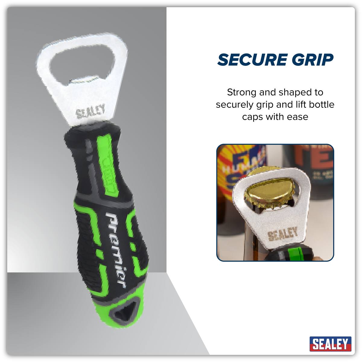 5.98 2026-05-27GripMAX® bottle opener. Ergonomic polypropylene and TPV rubber soft grip handle. Includes hanging hole for alternative storage.