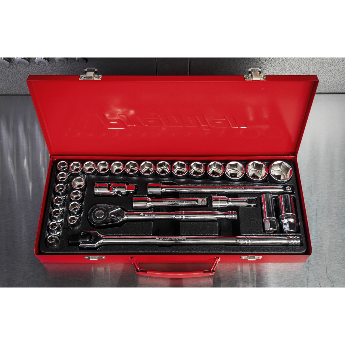 97.16 2026-01-18Deluxe professional socket set with heat treated Chrome Vanadium steel WallDrive® sockets. Dual satin/chrome finish. 48-Tooth gear-to-gear quick release ratchet. Supplied in metal storage case.