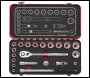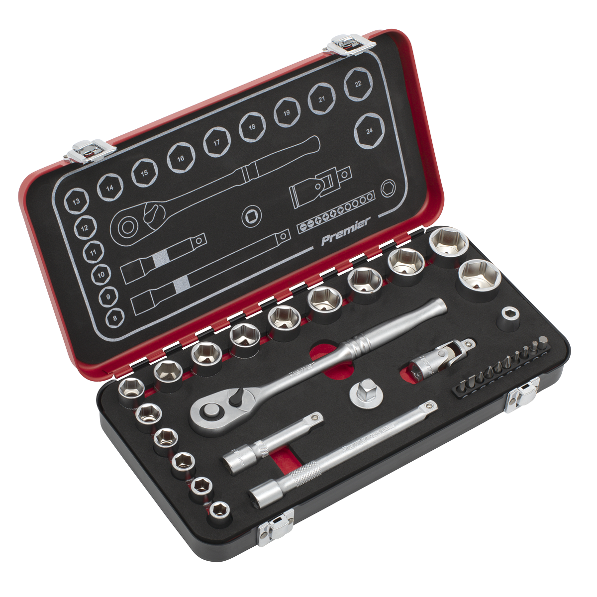 41.96 2026-01-17Professional socket set with heat treated Chrome Vanadium steel sockets and accessories. Fully polished micro satin finish. Covers sizes from 8 to 24mm. Features 90-tooth gear-to-gear ratchet wrench with quick release, extension bars, universal joint and adaptors. Includes contents map displayed inside the lid. Supplied in metal storage case with removable EVA foam tray. Contents: Standard Sockets: 8, 9, 10, 11, 12, 13, 14, 15, 16, 17, 18, 19, 21, 22, 24mm, 3/8”Sq Drive 90-Tooth Gear-To-Gear Ratchet Wrench with Quick Release, Extension Bars; 75, 150mm, Universal Joint, Adaptors; 3/8"Sq Drive -1/4”Hex, 1/2”Sq Drive Female - 3/8”Sq Drive Male, Bits; Slotted – 4, 5.5mm, Phillips - #1, #2, Pozi - #1, #2, Hex– 4, 6mm, TRX-Star* - T15, T20.