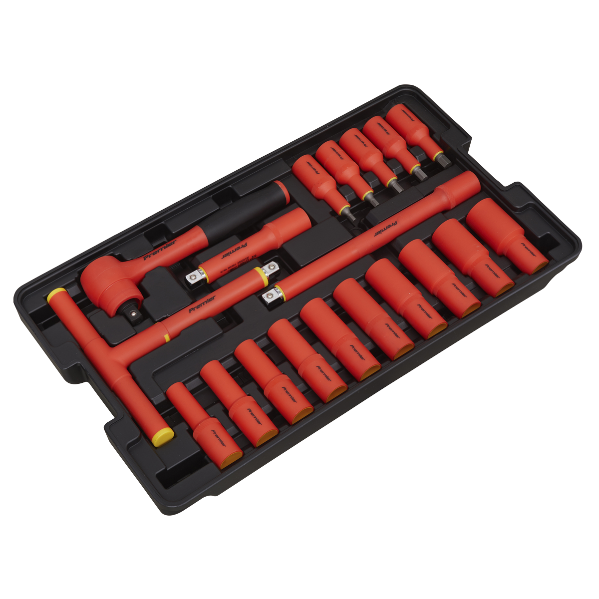 593.96 2026-03-27Hardened and tempered Chrome Vanadium steel sockets and accessories. Chrome plated for resistance to corrosion. Each component is fully insulated to VDE and EN 60900 standards to protect from electric shocks up to 1500V DC and 1000V AC. Features 45-tooth flip reverse comfort grip ratchet wrench with push-button quick release, sockets, socket bits, extension bars, T-bar, open-end wrenches, pliers, cable knife, voltage tester, nut drivers, screwdrivers and hex keys. Ideal for technicians working on modern hybrid and electric vehicles (1500V DC safe live working). Also suitable for electricians and other trades (1000V AC safe live working). Supplied in storage case.