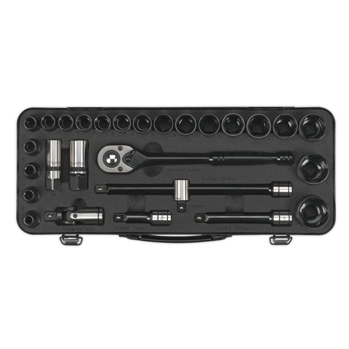 104.36 2025-12-01Professional socket set with heat treated Chrome Vanadium steel sockets and accessories. Fully polished black chrome finish with machined and lacquered surfaces. Covers sizes from 8 to 32mm. Features 72-tooth flip reverse ratchet wrench with push-button quick release, extension bars, spark plug sockets, universal joint and T-bar adaptor. Includes contents map displayed inside the lid. Supplied in metal storage case.