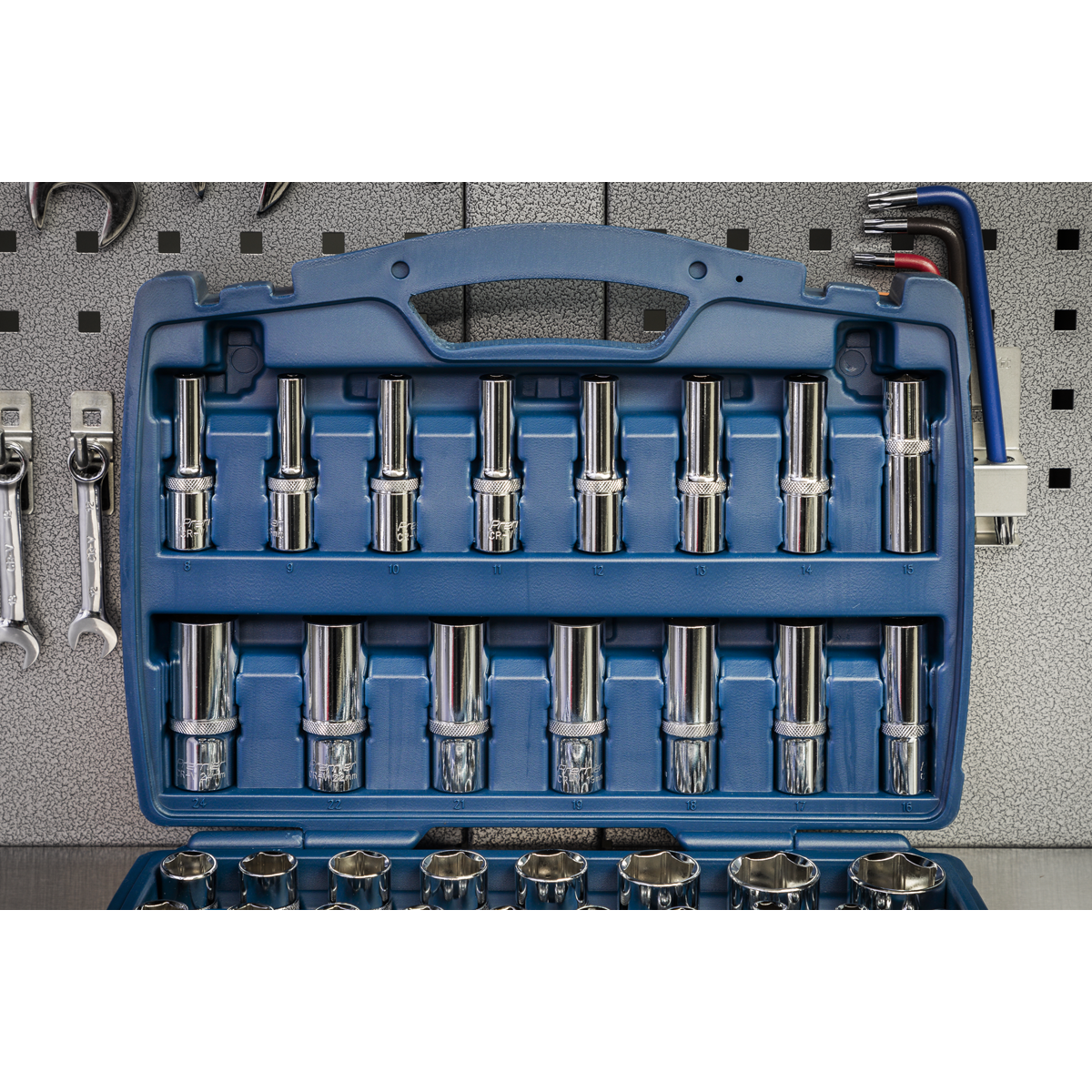 100.76 2026-02-26Heat treated, drop-forged Chrome Vanadium steel sockets and accessories with a fully polished mirror finish. Standard sockets cover sizes from 8-32mm and deep sockets from 8-24mm. Features 48-tooth gear-to-gear comfort grip ratchet wrench with push-button quick release, extension bars, spark plug sockets, universal joint and 3/8"Sq Drive - 1/2"Sq Drive Male Adaptor. Supplied in storage case.