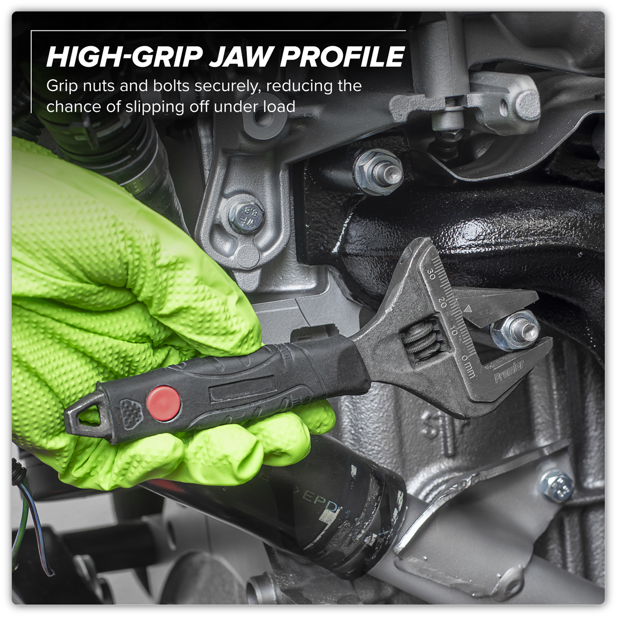 8.98 2026-05-26Hardened and heat-treated drop-forged Chrome Vanadium steel. 55% Wider opening compared to traditional adjustable wrenches. Precision ground, fully polished jaws with metric calibration for accuracy. Black phosphate finish for long term corrosion resistance. TPR soft grip non-slip handle. Hanging hole for easy storage solutions.