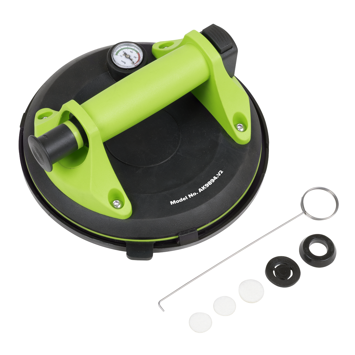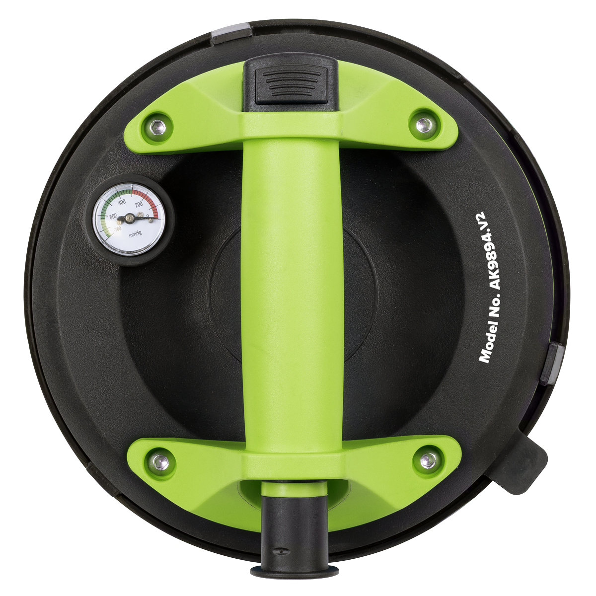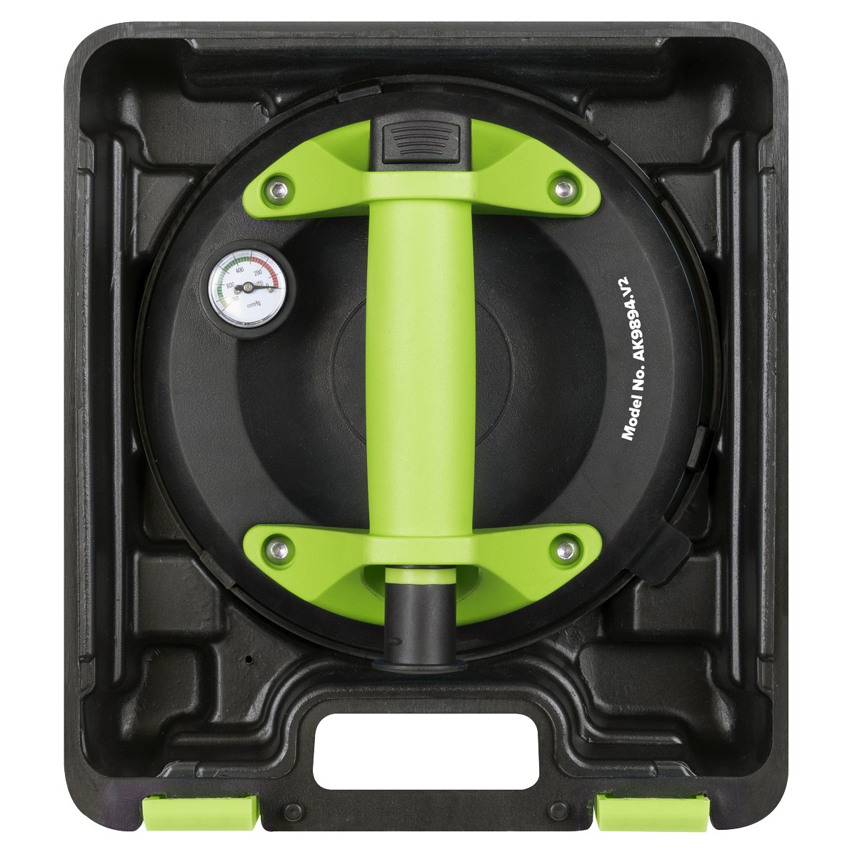 39.56 2026-05-18Heavy lift capacity of 110kg. Cup Diameter: Ø303mm/8”. Integrated pressure gauge to monitor and adjust suction power. Green line indicator to warn of vacuum loss. Release valve lever for quick removal. Fast attachment on rough, smooth, non-porous flat surfaces. 4-Layer rubber lip design for increased safety and prevention from overloading. Complete corrosion resistant finish. Supplied in storage case.