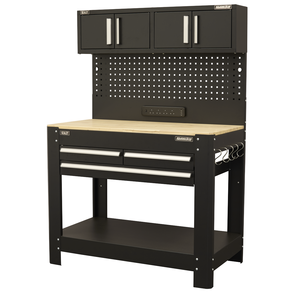 353.95 2026-05-17Manufactured from heavy-gauge, powder-coated steel for ultimate strength and durability. 20mm Thick wooden work surface ideal for heavy daily use. Integrated power bar featuring 4 x BS sockets, 1 x USB-C and 3 x USB ports (for full specification see Sealey Model No. EL34USBB). Two wall cupboards to keep tools handy and workspace tidy. Large drawer for storing bigger tools and materials. Two small drawers perfect for organizing fasteners and small parts. Smooth, ball-bearing drawer slides with non-slip liners to secure tools. Supplied with five hanging hooks.