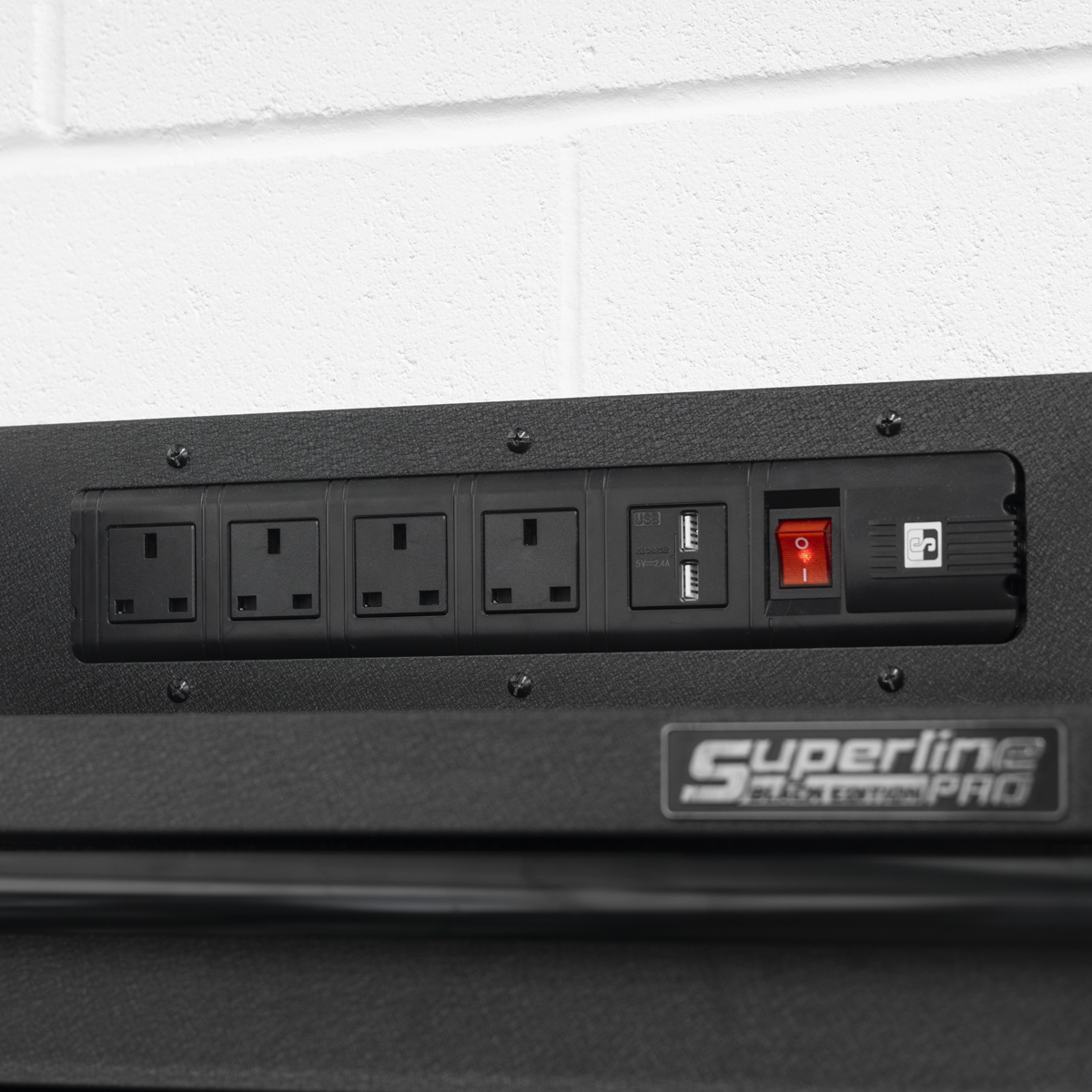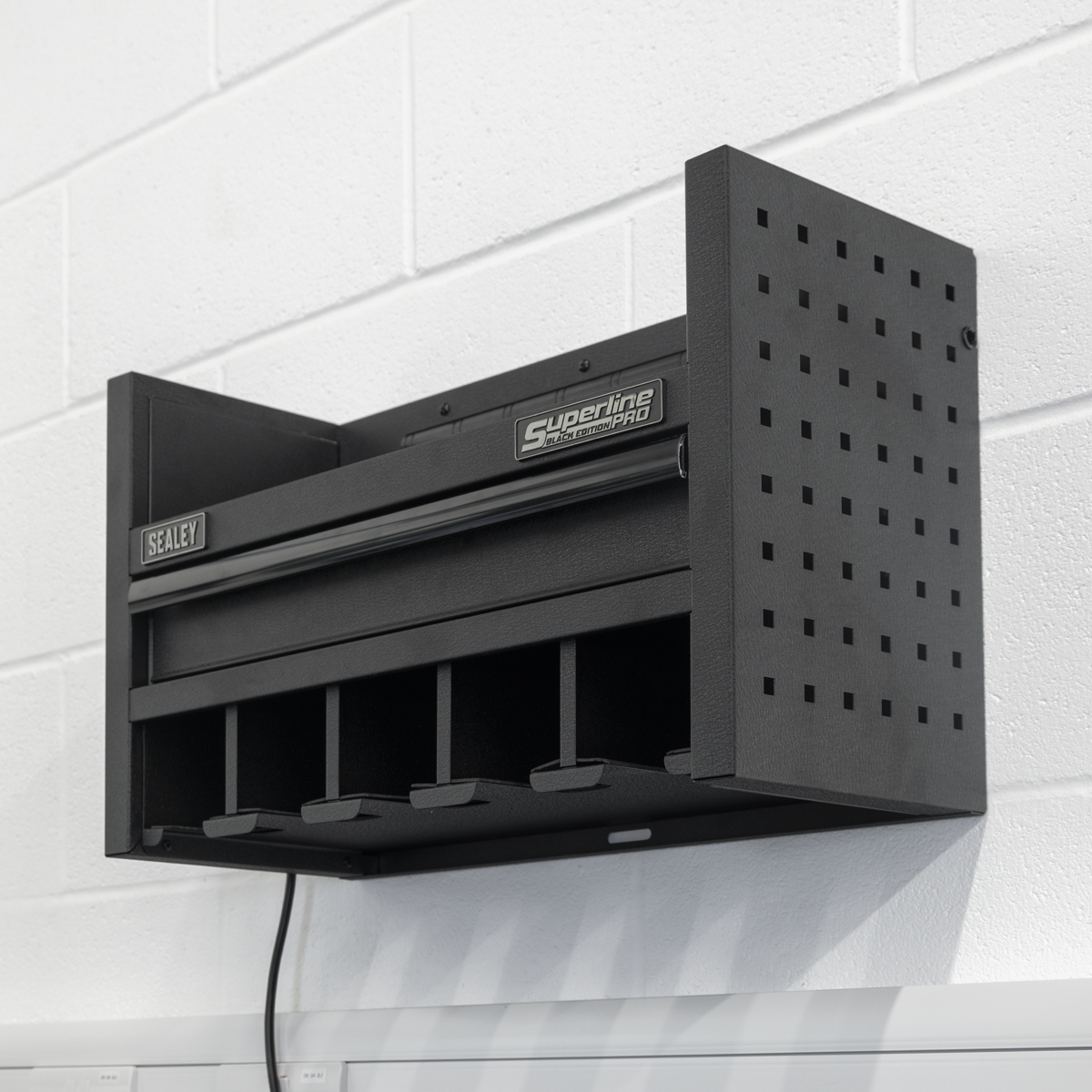 194.96 2025-11-06Wall mounting rack specifically designed for the storage of power tools. Open front bays make power tools easily accessible. Fitted with a power bar (4 x 230V, 1 x USB-C, 3 x USB). Side panels made from perforated steel for hook storage. Rust and solvent resistant black crinkle effect paint. One drawer with heavy-duty 35mm ball-bearing drawer slides.