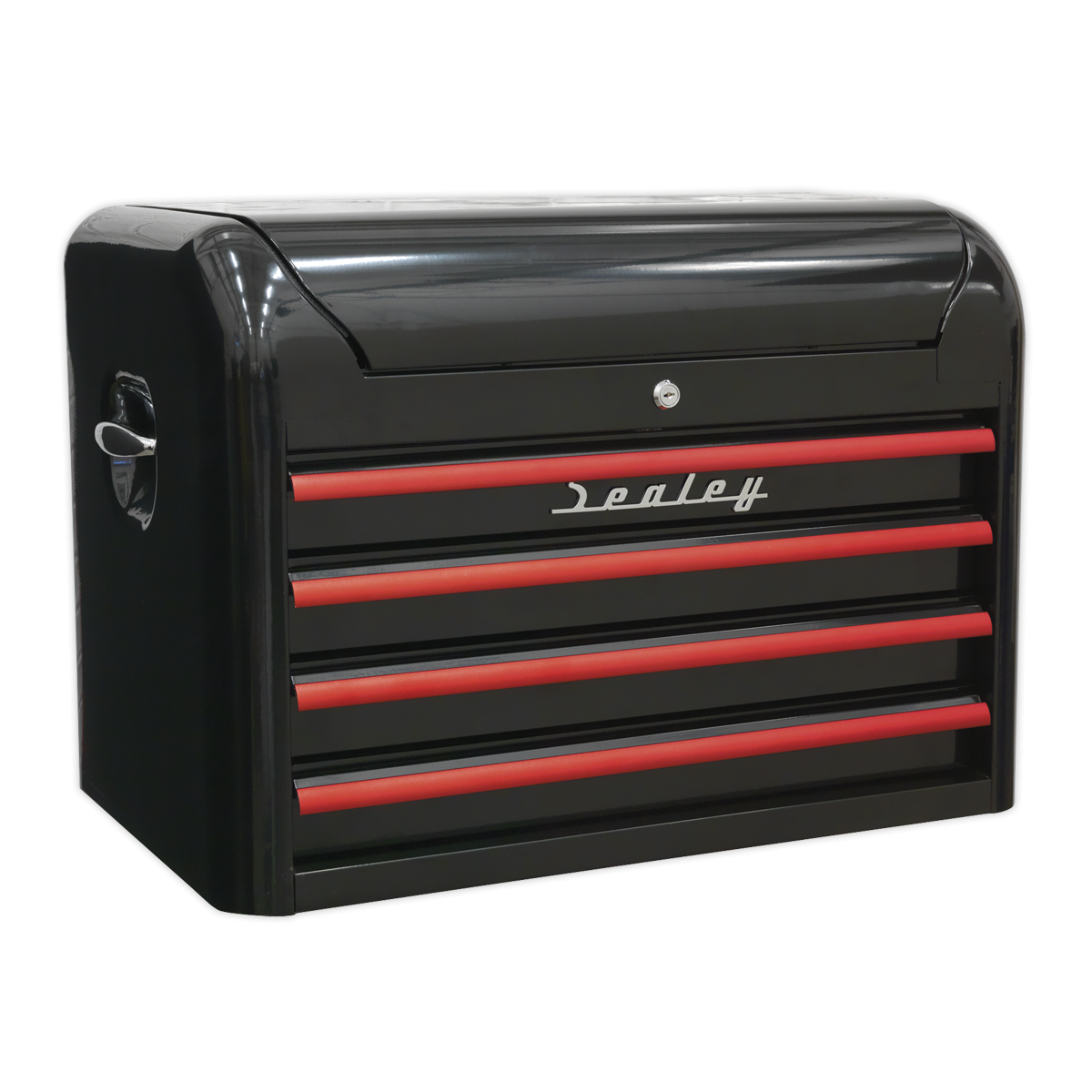412.75 2025-11-29Retro style topchest with modern day functionality. Features 4 drawers with ball-bearing slides and 'Lift & Latch' drawer pulls preventing inadvertent opening. Chrome plated side handles and lid supports. Retro theme is continued in a black colour scheme with red anodised drawer pulls and stylish heavy-duty castors, two with brakes. Drawers are fitted with liners and lock on one key turn. Fully lockable, supplied with two keys. Use Model No AP28204BR Rollcab and Model No. AP28102BR Mid-box to make a complete retro style stack unit.
