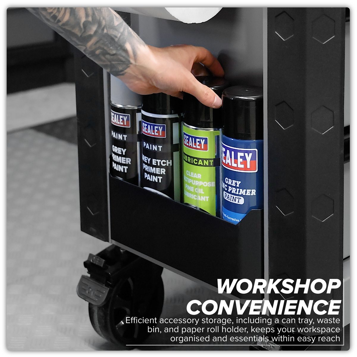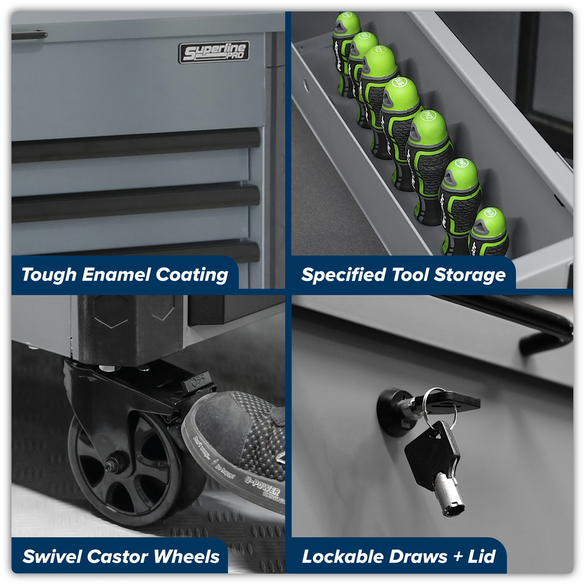 604.75 2026-01-03Manufactured from double skin side walls. Full length locking bars secure all drawers when the lid is closed which can then be locked by the barrel lock supplied with two keys. Coated in high-gloss triple baked enamel for protection against oil, dirt and mild solvents. Full length TPR anti-shock protective bumpers on all corners prevent damage when moving around the workshop. Fitted with four stylish Ø125mm castors and a durable shatterproof plastic side handle. Supplied with a can storage tray, waste bin and paper roll holder. Six drawers each supplied with a cut-to-size non-slip liner. Deep storage compartment inside of the gas strut lid.