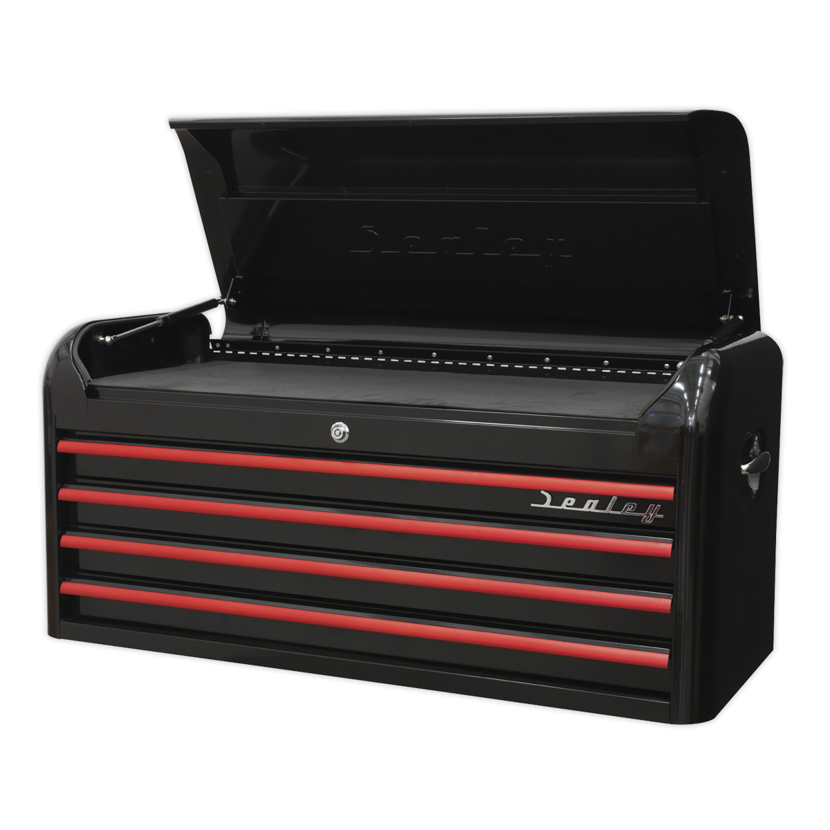 578.35 2025-11-09Wide retro styled topchest with modern day functionality. Features 4 drawers with ball-bearing slides and red anodised 'Lift & Latch' drawer pulls preventing inadvertent opening. Gas strut opening clam shell lid providing additional storage. Black colour scheme with red anodised drawer pulls. Recessed chrome side handles for easy manoeuvrability. Drawers and top lid are fitted with drawer liners and lock on one key turn. For use with Model No. AP41206BR Rollcab to make a complete retro style stack unit.