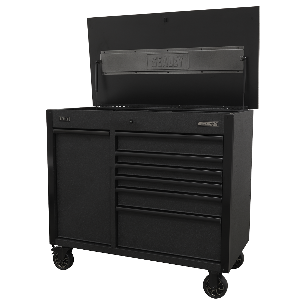 1139.95 2026-01-11All heavy-duty steel construction and manufactured with steel inner walls for extra strength and durability. Heavy-duty 45mm ball-bearing drawer slides provide superior performance, suitable for heavier loads. Full height rear locking mechanism, locks smooth running soft close drawers in place. Rust and solvent resistant black crinkle effect finish. Fitted with four Ø125mm PP wheels with black chrome effect alloys, two fixed and two locking swivel castors. Each drawer features stylish black anodized heavy-duty drawer pulls plus pre-cut non-slip liners. Power tool charging drawer fitted with 4x 230V, 1x USB-C and 3x USB. Stainless steel 'flip-top' split providing a work surface and additional storage. Two cylinder locks allow drawers and power tool charging drawer to be locked separately.
