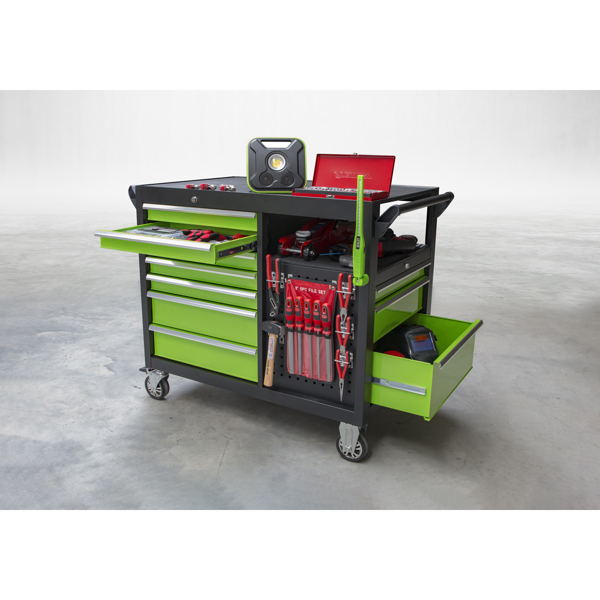 1088.95 2025-12-01Heavy-duty mobile workstation with ten drawers. Drawers run on 45mm ball-bearing slides with a weight capacity of 40kg per drawer. All drawers fitted with aluminium handles and 2.5mm EVA non-slip liners. Two sets of drawers lock separately for safe storage. All panels made of perforated steel for hook storage. Supplied with two shelves to be mounted as required. Top of workstation lined with 10mm EVA mat. Four alloy style Ø125mm castors, two fixed and two swivel with quick release brake. Steel handle at either end for easy mobility.