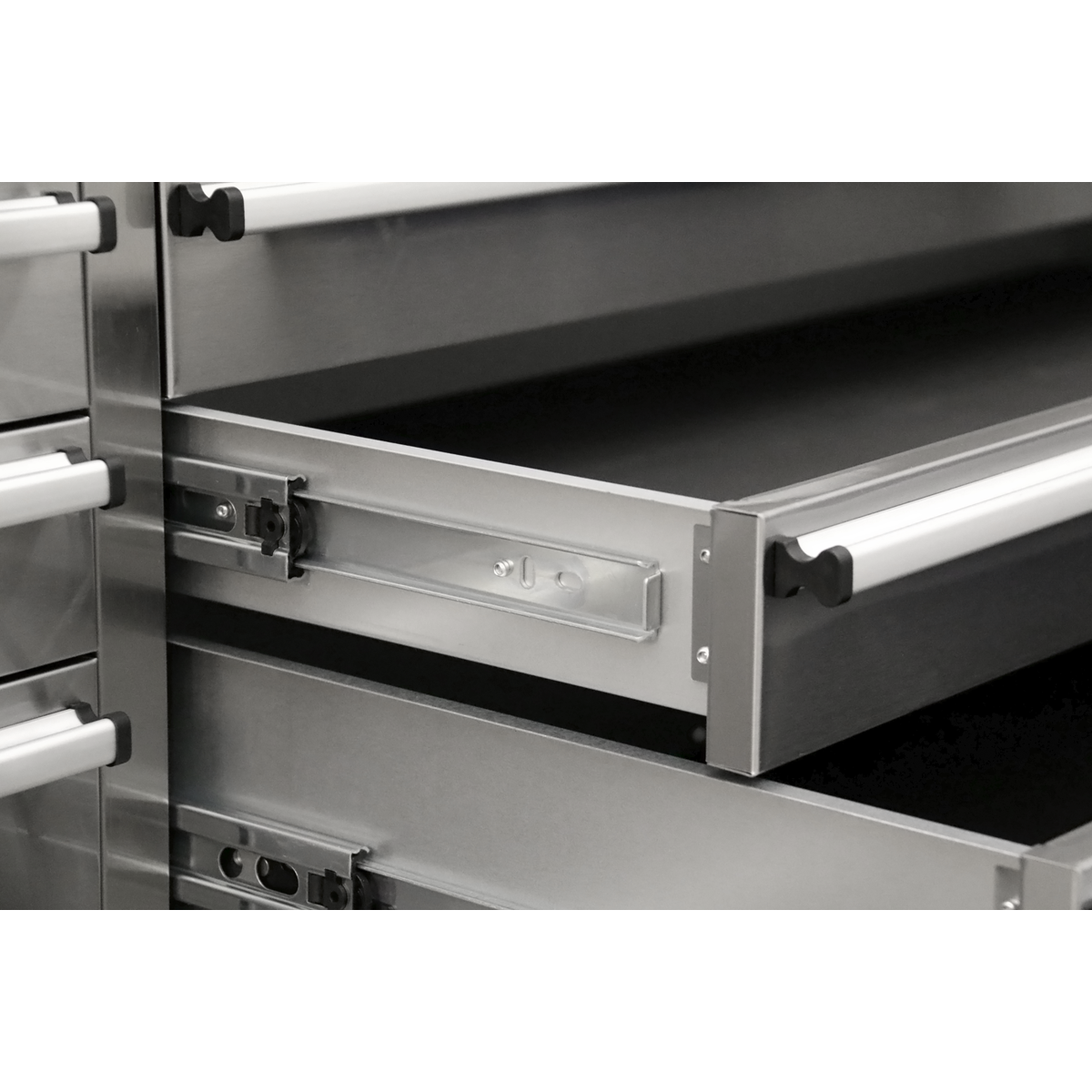 1292.95 2026-01-11Anti-fingerprint stainless steel construction. Supplied with a 38mm thick wooden worktop. 10 Drawers with a 45kg capacity each. Each drawer features aluminium pull handles and non-slip liners. Four large castor wheels, two fixed and two swivel, that include brakes. Supplied with a pegboard back panel - ideal for hanging tools - and two gas strut wall cabinets for added storage. Cabinet supplied with a heavy-duty side handle for comfort and control when manoeuvring. Supplied with locks and two keys each. Some simple assembly required.