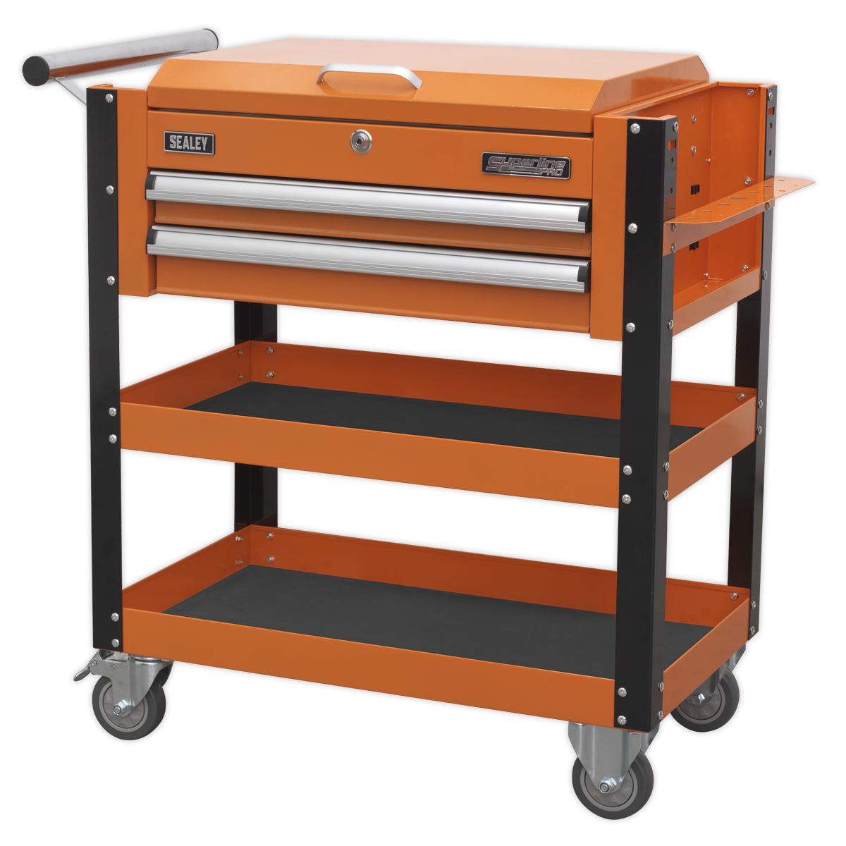 304.75 2026-01-11Garage or workshop trolley with two shelves and a lockable gas sprung supported lid, which allows for items to be kept safe when not in use. Features two 40kg capacity drawers with ball-bearing slides. The unit features an additional screwdriver holder ideal for quick access whilst working. Two lower storage shelves with a 50kg capacity each, can be installed base down or base up to give either tool and component security or unobstructed access. Fitted with four heavy-duty Ø100mm PU castors, two of which are locking.