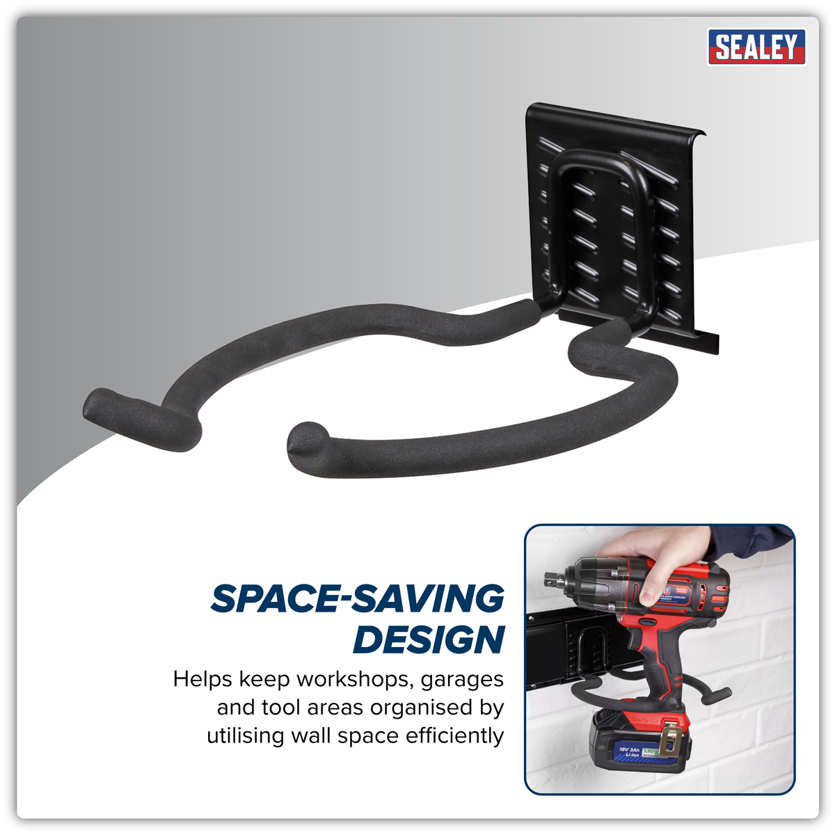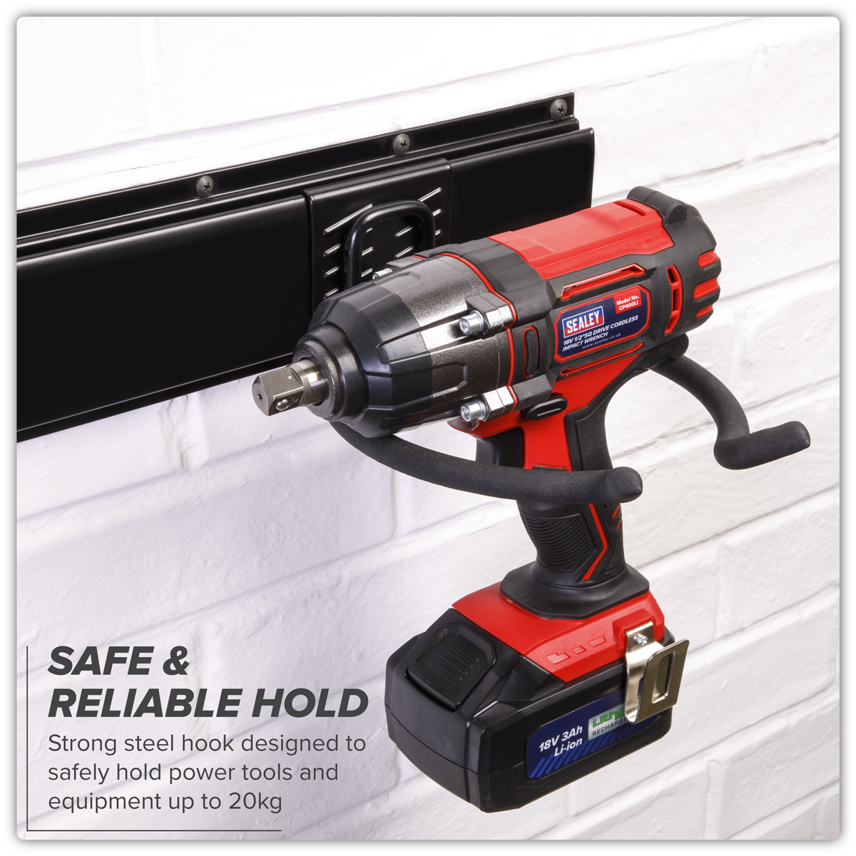 5.24 2026-05-07Steel storage hook for power tools. Powder coated to prevent oxidisation. PVC Wrapped to avoid damage to tools and equipment. Designed to be used in conjunction with Wall Mountable Storage Rail Model No. APH01 for quick and easy installation and repositioning. Overall maximum load of 20kg. Dimensions (W x D x H) 166 x 238 x 90mm.