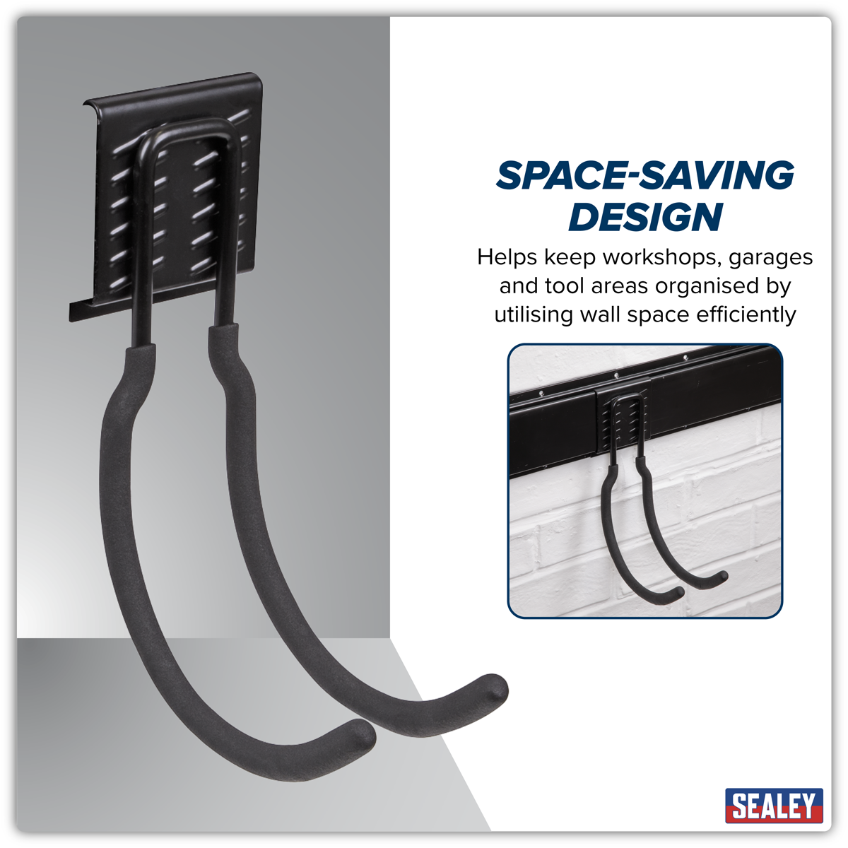 5.24 2026-05-26Large steel J storage hook. Powder coated to prevent oxidisation. PVC Wrapped to avoid damage to tools and equipment. Designed to be used in conjunction with Wall Mountable Storage Rail Model No. APH01 for quick and easy installation and repositioning. Ideal for holding electrical cables, hoses, tools and bikes. Overall maximum load of 25kg. Dimensions (W x D x H): 77 x 182 x 230mm.