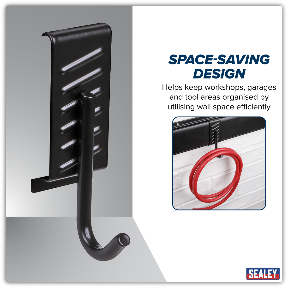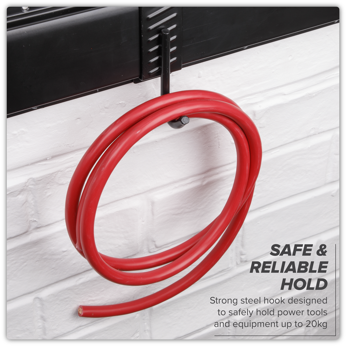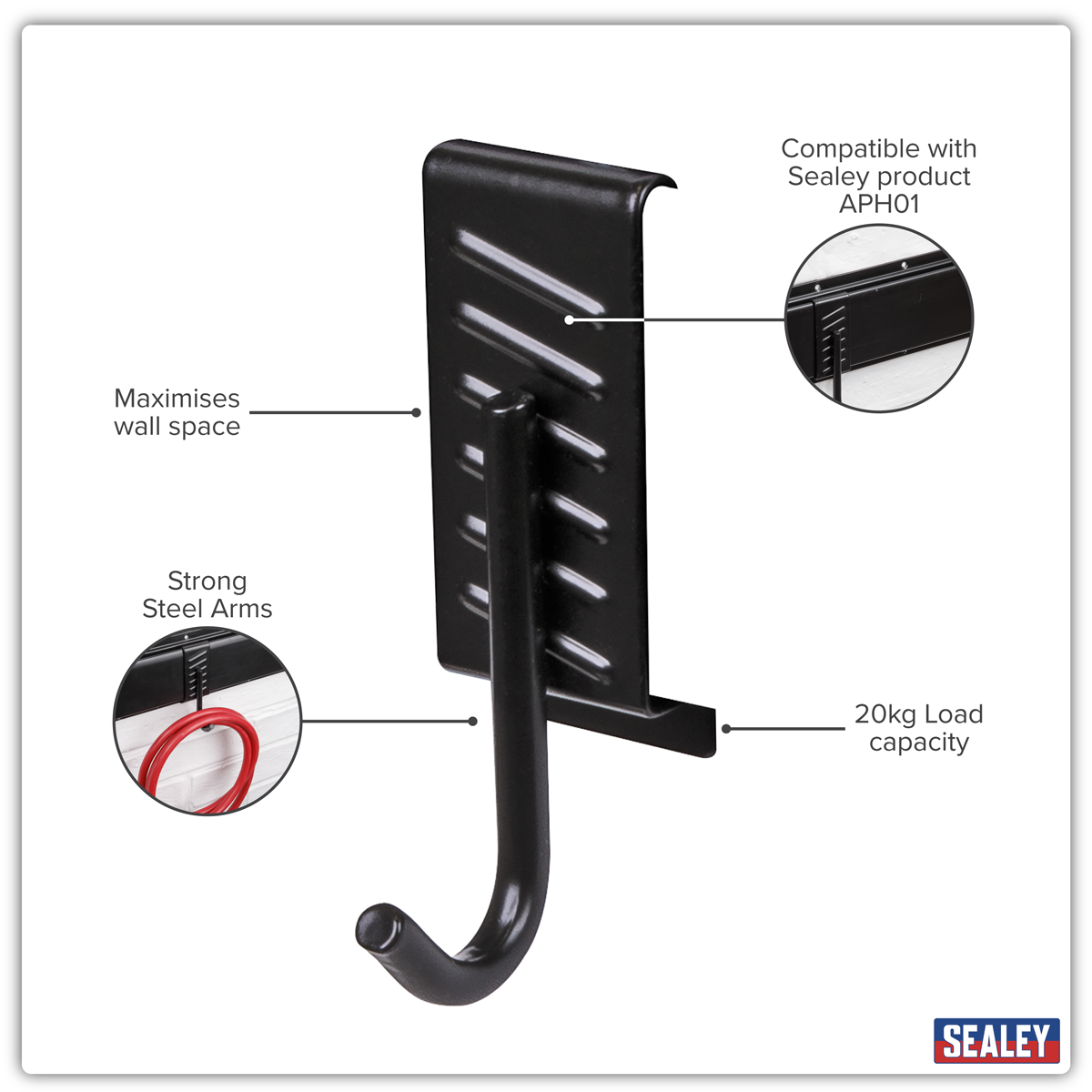 4.40 2026-05-06Steel single J prong storage hook. Powder coated to prevent oxidisation. PVC Wrapped to avoid damage to tools and equipment. Designed to be used in conjunction with Wall Mountable Storage Rail Model No. APH01 for quick and easy installation and repositioning. Ideal for holding cleaning supplies and bags. Overall maximum load of 20kg. Dimensions (W x D x H) 40 x 60 x 120mm.