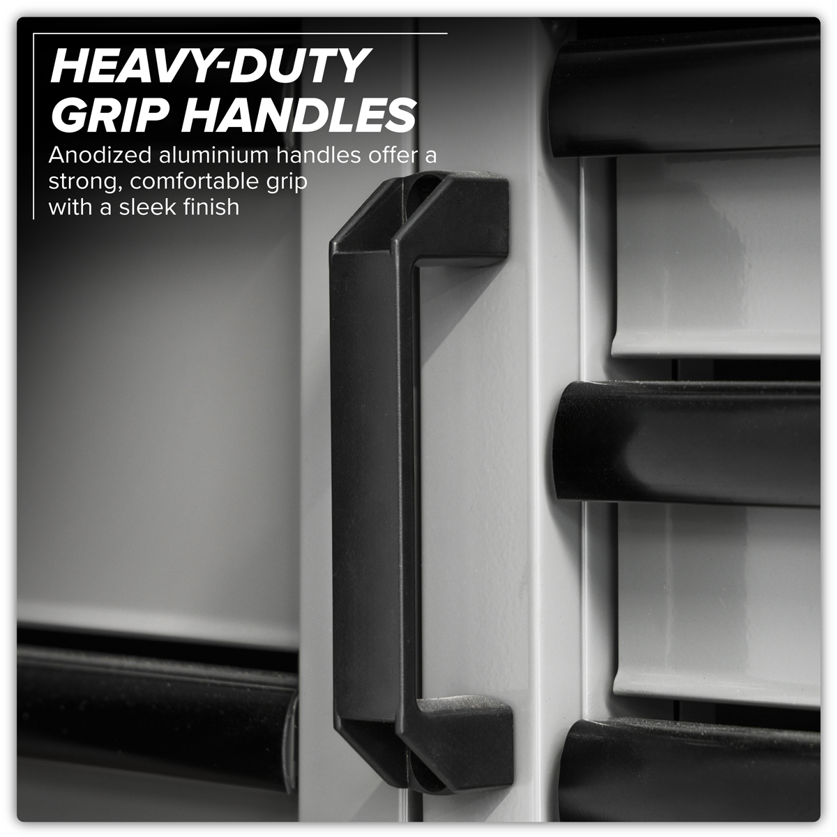 2279.95 2026-01-24Tough and durable construction with a high gloss powder coated finish. Black anodized aluminium handles and drawer pulls. Drawers fitted with soft close ball-bearing drawer slides. 38mm rubber wood worktop. Gas struts on wall cabinet doors. This item is heavy. Extra assistance must be provided at the delivery point to help its safe delivery.