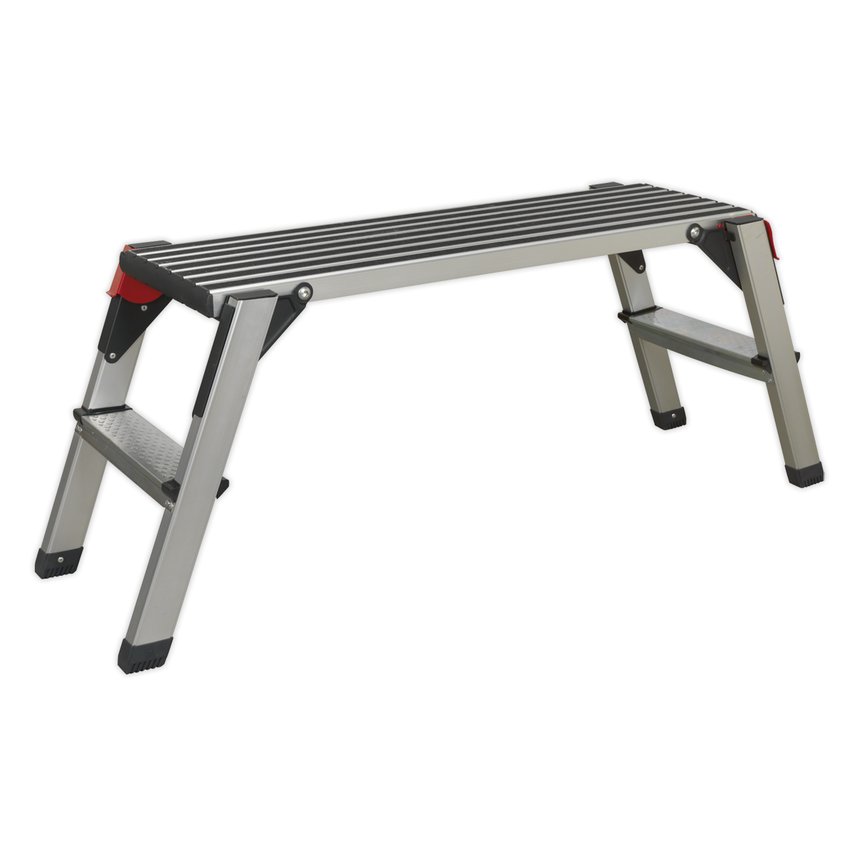 122.96 2025-12-07EN 131-4 Approved folding and portable aluminium platform with 150kg capacity. Large, ribbed non-slip platform and treads for safe and easy manoeuvrability. Durable aluminium alloy frame with ribbed feet provides extra stability. Safety locking catches on legs. Folds flat for easy storage and transportation.
