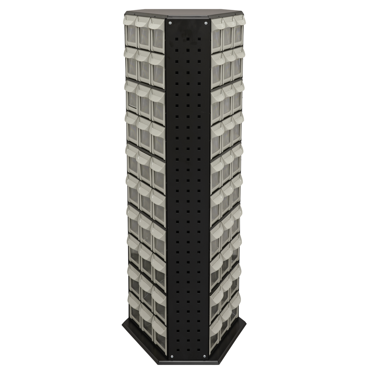 575.95 2025-11-08Freestanding rotating storage system featuring 90 small parts bins. Ideal for workshop or stores use. Fitted with roller bearings allowing 360° movement.