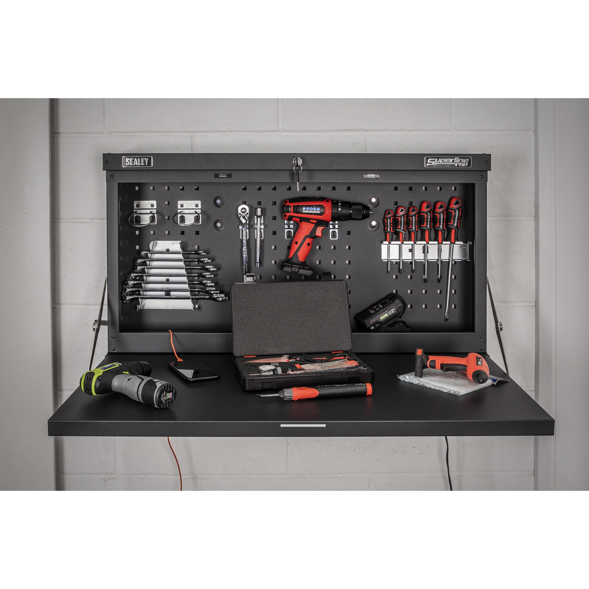 170.95 2026-01-24Wall mounting foldable workbench ideal for garages and workshops where space is at a premium. Heavy-duty hammered metal workbench with 100kg capacity. Supplied with 600mm wall mount bracket and hardware pack. Back panel pegboard design compatible with Sealey TTS Hooks with a 10cm deep gap for tool storage. Lockable design for added security of contents within. Also features two cable and plug grommet holes either side for corded tools or power bar. Overall size: 914 x 620 x 560mm.