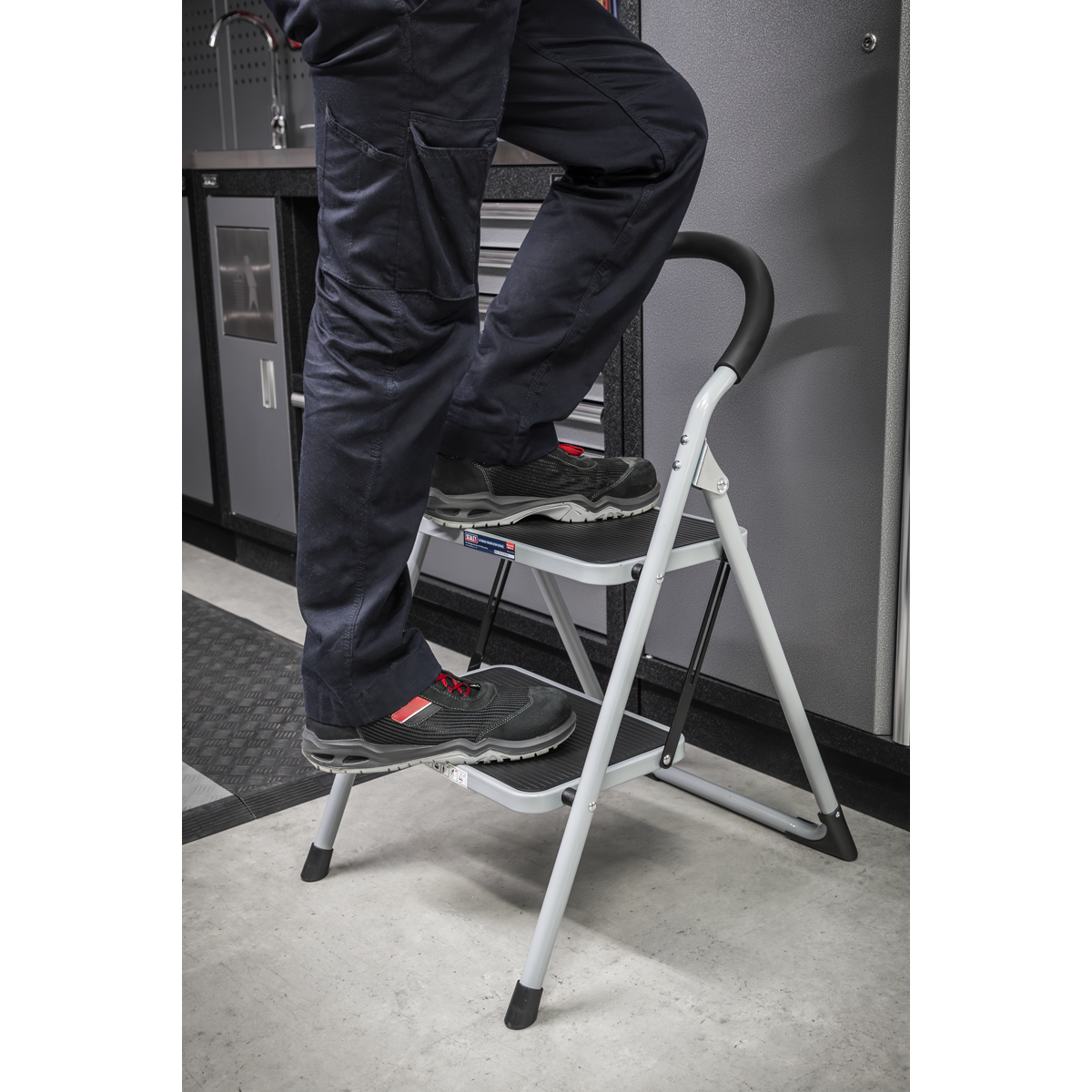 49.15 2026-02-19EN 14183 Tested steps with 150kg capacity. Tubular metal construction with composite feet for added stability. Features two large anti-slip treads. Foam-cushioned hand rail for added comfort. Also suitable as a stool.